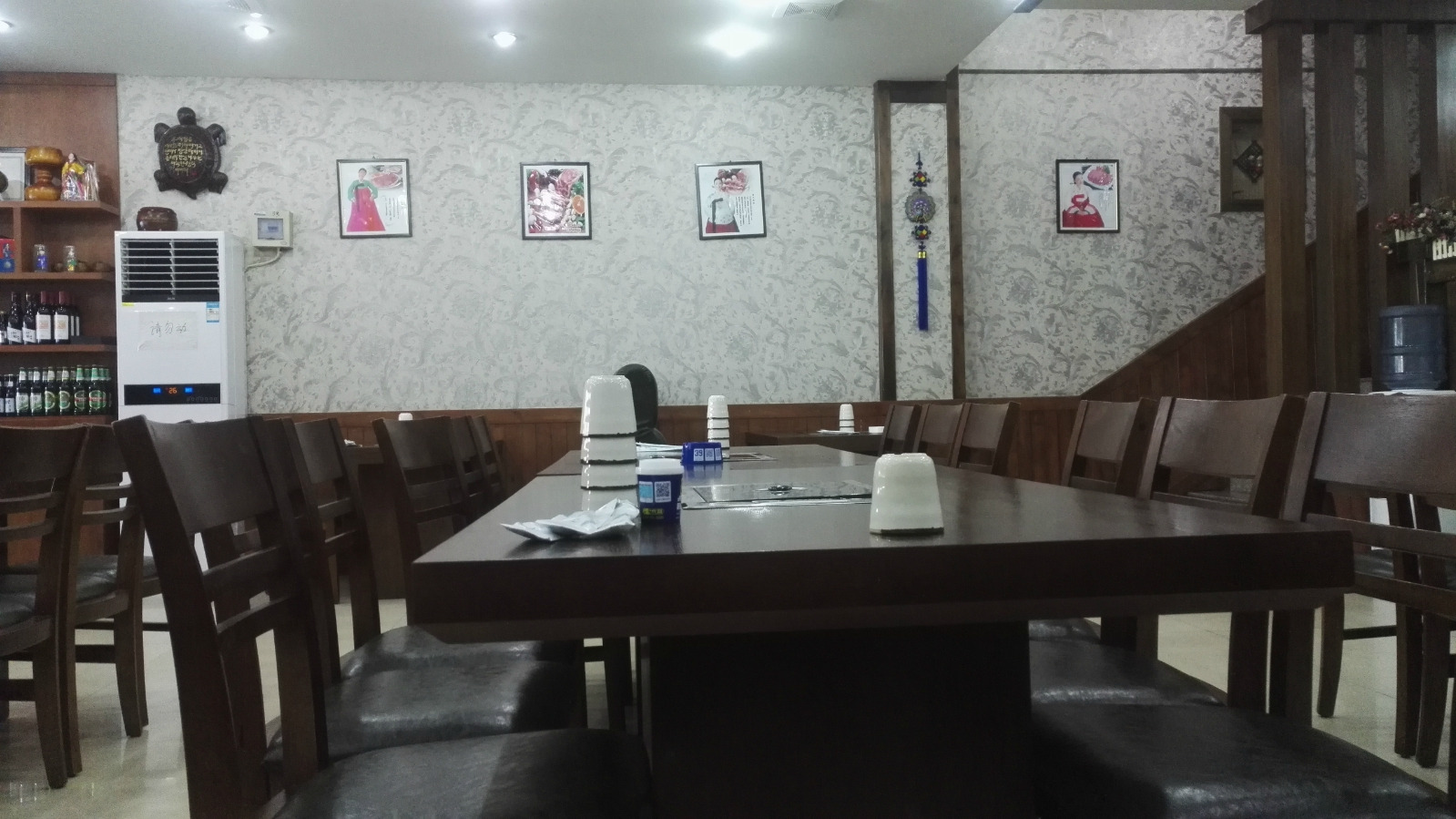 一楼面积不算特别大,散落着十来张深颜色的桌子,内部的装修自然透着浓浓的朝鲜族风格,服务员有几位应该为朝鲜族,可以说流利的朝鲜话。