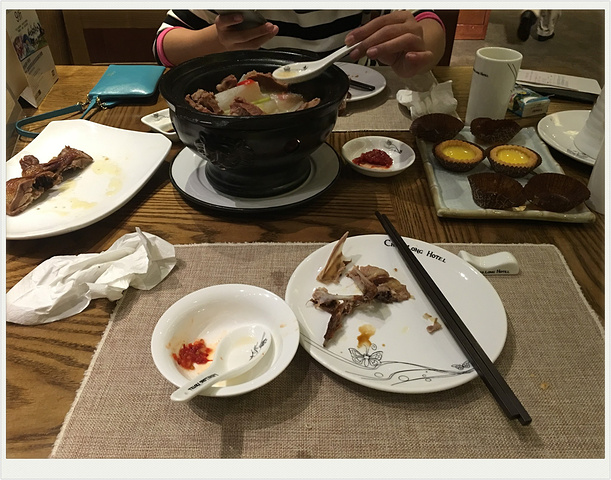 然后饿了一晚上,我们出酒店去觅食,旁边就有彩蝶谷,开到半夜12点,价位应该是最实惠的在长隆里,100左右。我们吃了人均160。。。 牛肉萝卜煲汤非常好吃,蛋挞不错,J喜欢。乳鸽不如后来在沙面吃的好吃,其他的记不住了嗷。。。。 我觉得广州吃煲汤类的基本都不会难吃,都很好吃