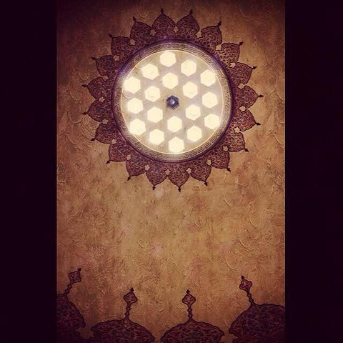 对称型三号,又有采光又吊球的典型房顶。据说这个球的意思是地球。皇宫除了这些宫殿之外还有几个小型的展览厅,其中一位大师的书法主题展非常有趣。阿拉伯文的花体书法像画画一样。笔画们结合在一起组成一个完整的图形,比如最著名的一个咒文长得就很像一艘帆船。还有个馆专门展各国传过来的宴席餐具,中国的不是官窑有点丑