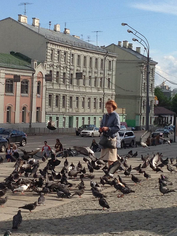 图书馆前喂鸽子的女人,雕像头上的鸽子,还有街旁的鲜花。