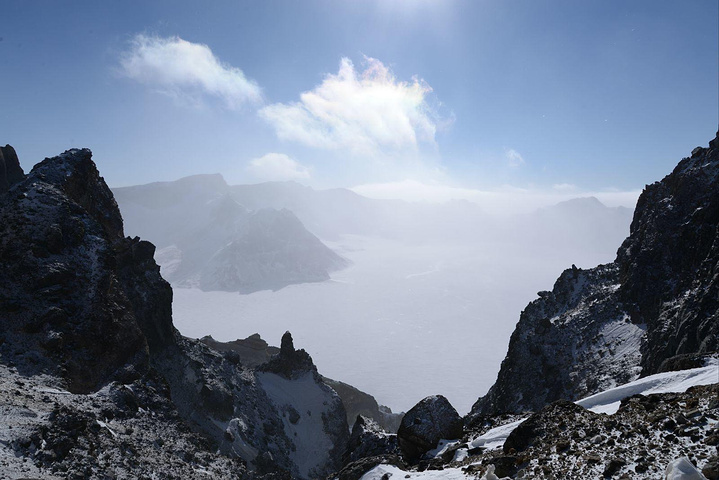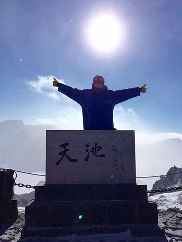 这就是姜童鞋身后的天池啦~ 当天我们去的时候雾太大,看不到天池,天气好的话可以看到蓝蓝的天池湖面,千年不结冰哦