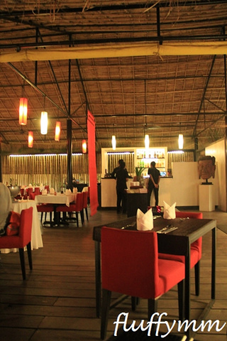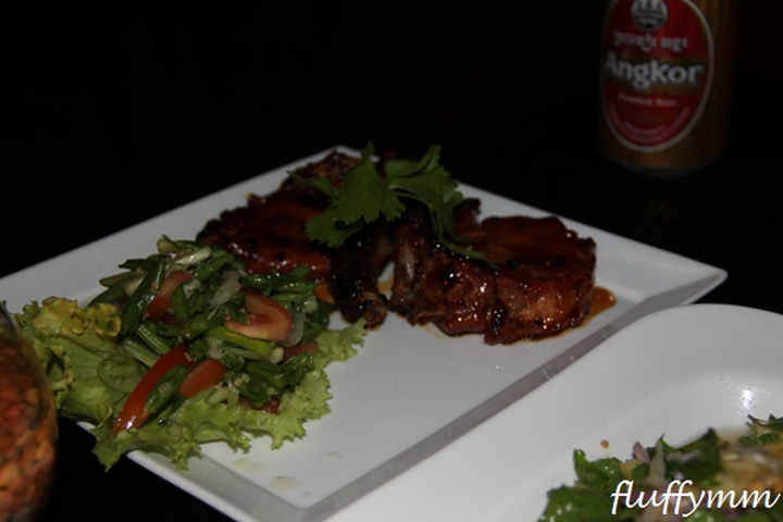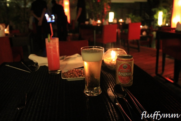 蜡烛也足够昏暗,可以让你不用看清自己到底吃的啥,只需关注味道即可。 点了菠萝大虾沙拉,Amok fish,炸猪排,Angkor 啤酒,鸡尾酒Angkor sunset。