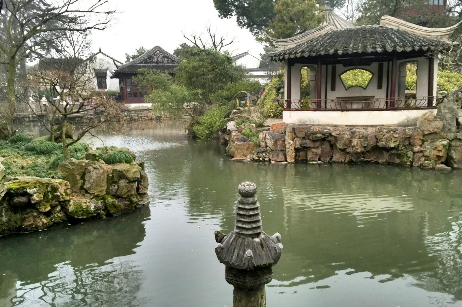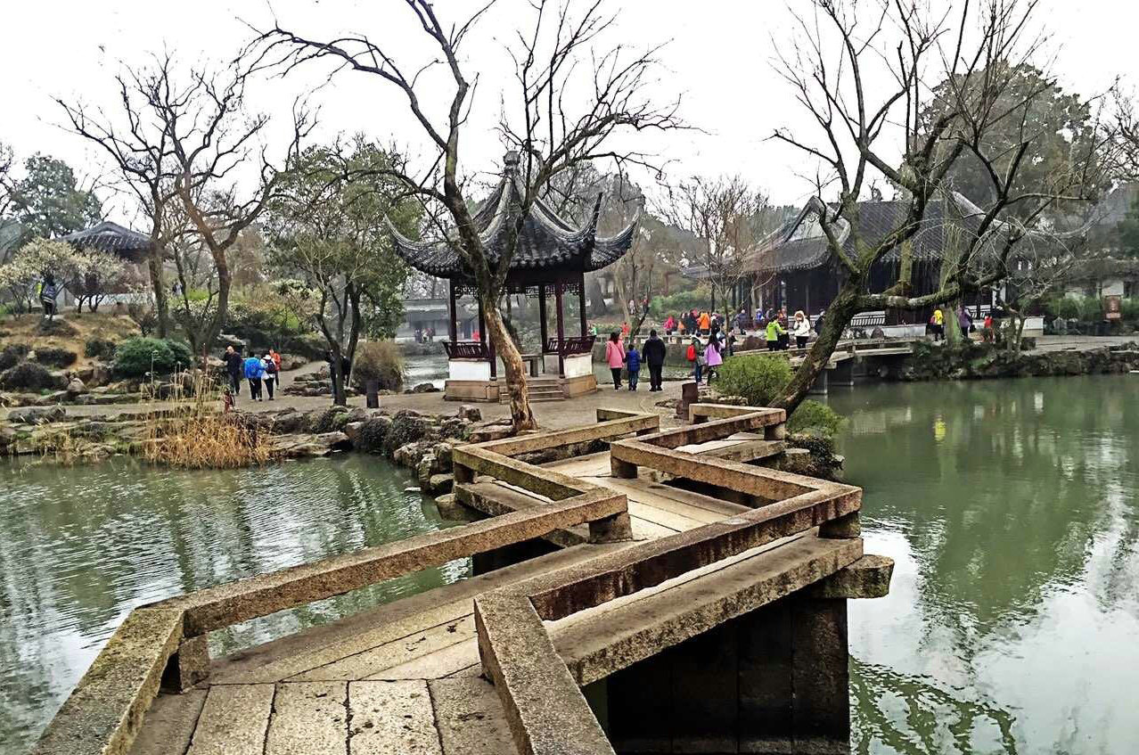 拙政园是我在苏州所有景点中最喜欢的一个,没去之前以为一下子就能逛完,去了之后才发现,拙政园真的好大的说,起码得要两个小时以上。拙政园被称之为全国著名四大园林之一,也是是苏州四大园林之首,到了之后果真名不虚传整个拙政园里庭院错落、花木为盛,无一处不透露着精细设计之意。整个拙政园都是以水为中心的,园林内有池塘,有池塘的地方必定会有云亭。所有的云亭建筑都显得格外大气却又给人不奢华的感觉,云亭里比较好看的就是楼阁轩榭,楼阁轩榭建在水池的旁边,而且所有的窗子都是漏窗,从里往外看恰到好处的能看到窗外的假山和水池,真是太神奇了。整个拙政园可以说是山水萦绕,水池旁边除了云亭还有假山和花草树木,所有的植物都布置得非常恰到好处。假山的样子也是千奇百怪的。里面最有名的应该就是地上的福寿石图,福寿石图就是还多的小石子绘成的一福寿两字,据说绕福走一圈,再穿过寿字,寓意添福添寿,福寿绵长。拙政园里的植物也很多,据说一年四季都会有不同的花草展示。园内的一切都非常美,简直就是一副人造而成的画卷一样。另外给去拙政园的朋友个提醒,门口会有一些黄牛,找你搭讪说售票处已经不买票了,不要上当哦,也不要跟他们买票,很多都是假的。另外作为门外汉不懂园林设计的我们可以在门口处租个掌上导游机,20元/台,真的很有用哦。拙政园很大最后的游览方式是从东边到西边的方式游览。