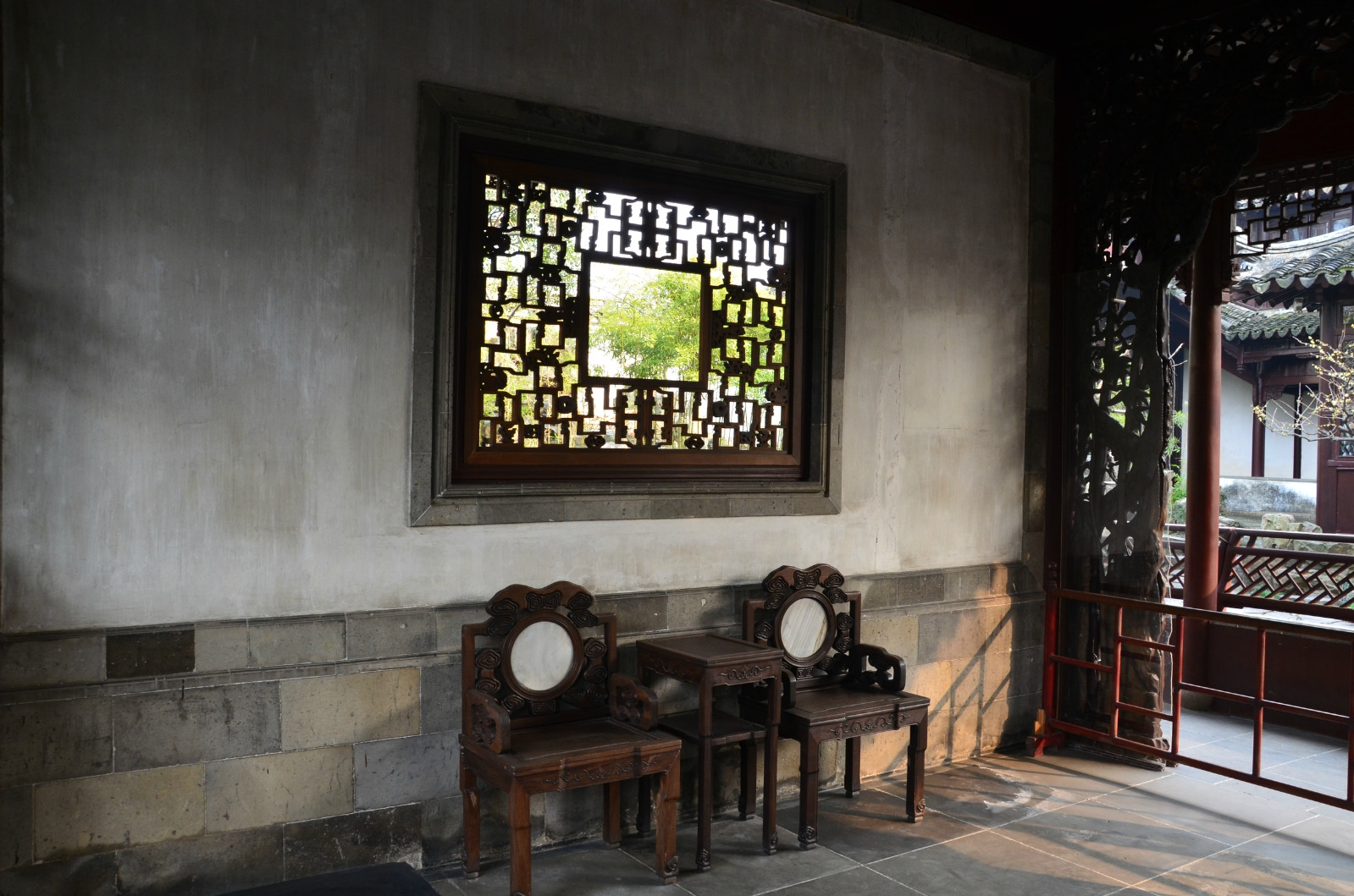 山水间内南有杞梓木雕“岁寒三友”落地罩,为镇园之宝,双面雕镂松、竹、梅,雕艺技巧精湛