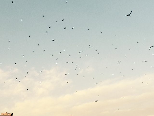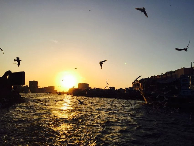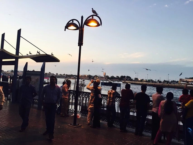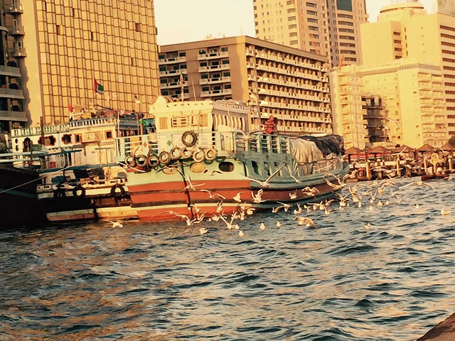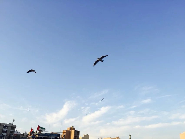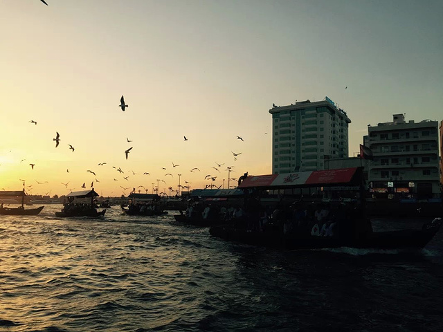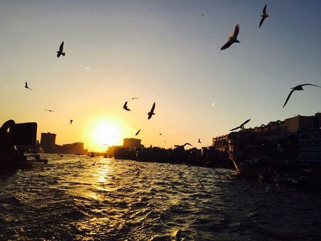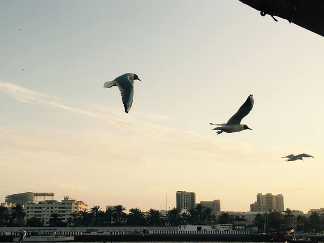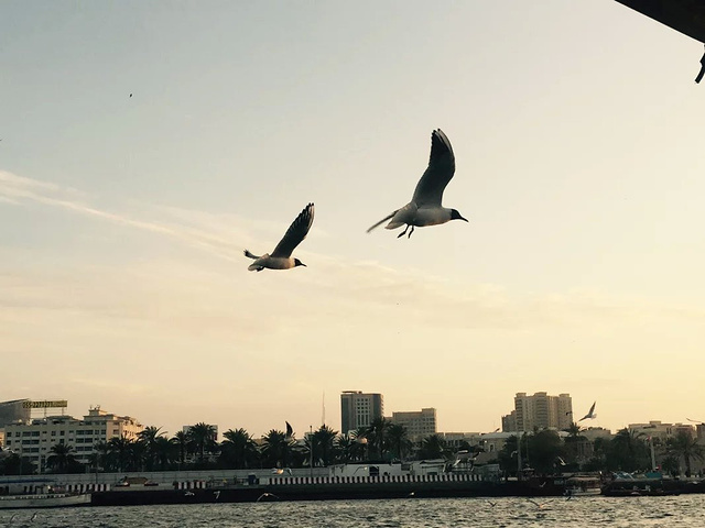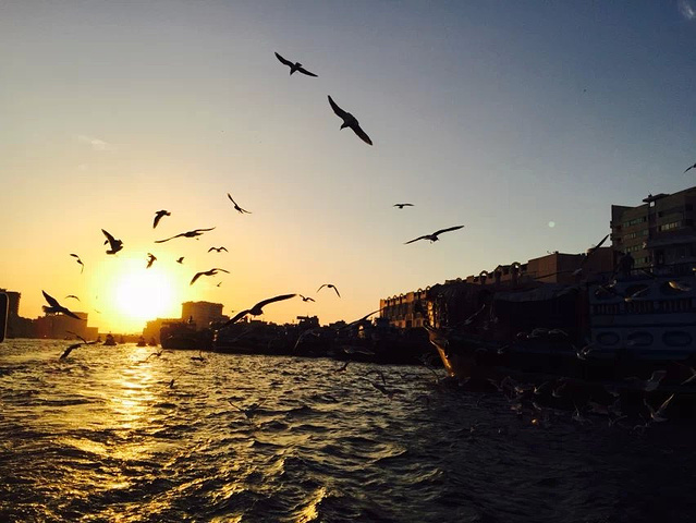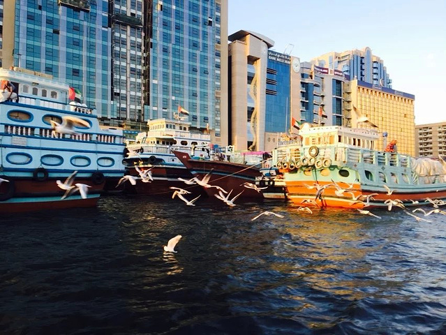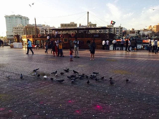 迪拜河上的码头,是鸽子们的热爱地 傍晚的天空晚霞似乎是我讲过最美的晚霞,河上一船又一船的划过,天空上海鸥,鸽子 飞来的越来越多,围着上空飞来飞去,似乎希望游客们能给更多食物,要不然就不罢休了。 广场上一地的鸽子,我轻手轻脚的蹲在中央,希望能与他们合个照, 结果鸽子们一下子全飞起来了,