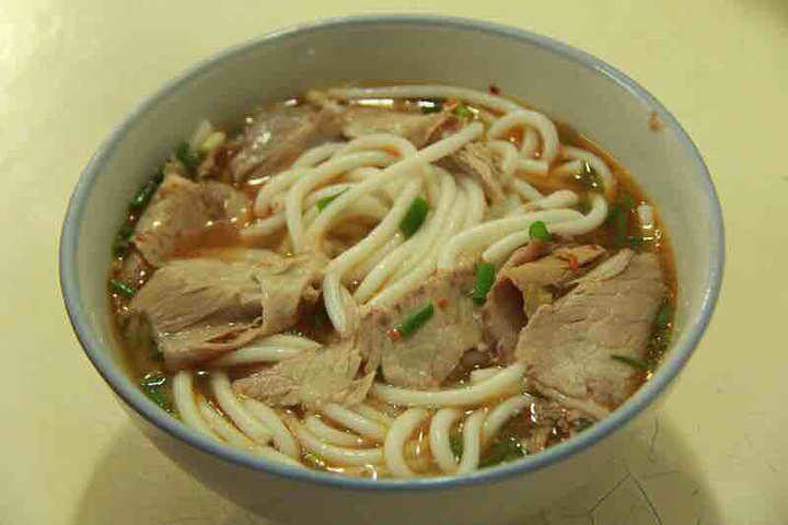 是本地知名的小吃老店。这里的招牌就是用猪骨汤烫制的米粉或米皮,佐以精瘦的猪腿肉片,汤鲜味美。