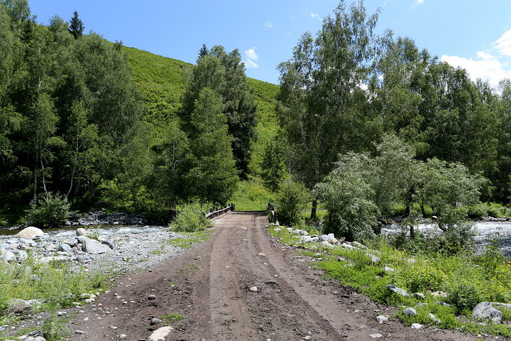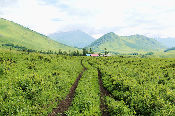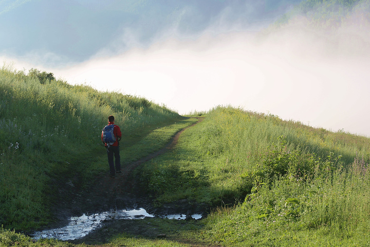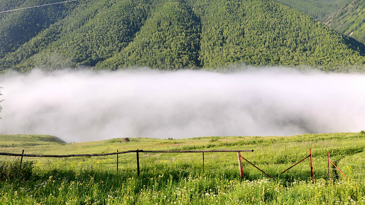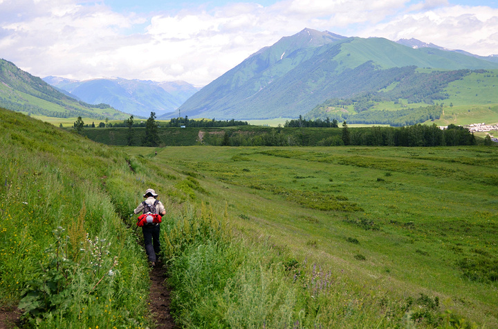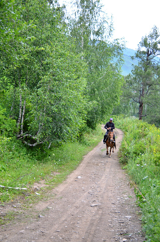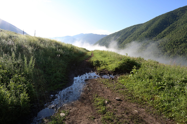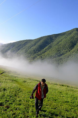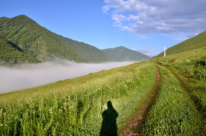 早上还窝在被子中不想爬起来,就被五花肉同志的声音吵醒了:“同学们,赶快起来,现在外面一片云海!” 顾不上刷牙洗脸,衣服一套,鞋子一穿就往外冲。正面对半路客栈的是一座峡谷,而半路客栈恰巧就在这峡谷的上头。由于峡谷里的水流温度和空气有差异形成云雾,填满整个峡谷的缝隙。我们都像没见大场面的小孩,不停按动快门。渐渐,随着地表温度的上身,云雾也开始往上飘。不一会儿,半路客栈前的空地就被云雾占满,而五花肉通知早就淹没在云海之中。 走着走着小溪越来越多,起初我们也没注意过,任然跟着土路上的马道走,但是发现越走越不对。土地越来越泥泞,水流深也越来越多,直觉告诉我们这并不是普通的路。当我走在最前头开始思索该如何前进时早就不清楚后面队伍是否整齐。五花肉同志在很远地方猛叫一声,这才发现我早就脱离了他们的队伍。原来,五花肉和阿姐在后面走路的时候正好遇到骑摩托车经过的半路客栈的老板。老板恰好去禾木接他的夫人,而我们的马夫胡木尔完全不知道消失在哪个地方。客栈老板告诉我们走错了路,我们走的这条路是当地村民才走的,而我们正好走在了三岔路口。如果沿着前面那条路继续走下去就会走到黑湖--也就是第三天徒步的终点。五花肉其实早就叫我很多次,可是由于水流声实在太大导致我什么都没有听到。 客栈老板带我们走到一个巨大的水塘前,指着前面的路说要走对面的路才行。我们之前又经过这片水塘,由于水塘面积太大所以会给我们造成一定的假象。客栈老板告诉我们已经走错了路。接下来,老板又摩托车一个个把我们渡过水塘,由于水塘的水很深,摩托车差点陷在泥土中。之后我们摆脱老板把柔弱的阿姐带到禾木去,我们三个人继续前进。 走着走着,胡木尔这个拉皮条的兄弟突然出现了,让他带着台妹往禾木走,我和五花肉两个人继续徒步前行。站在山坡上似乎都可以望见禾木整座村子,突然间五花肉同志不走了,站在路前面发愣,我走上去刚要开口,他指着前面用发抖的声音说“看”。 顺着他手指的方向,我见到大雨从前面飘过来。