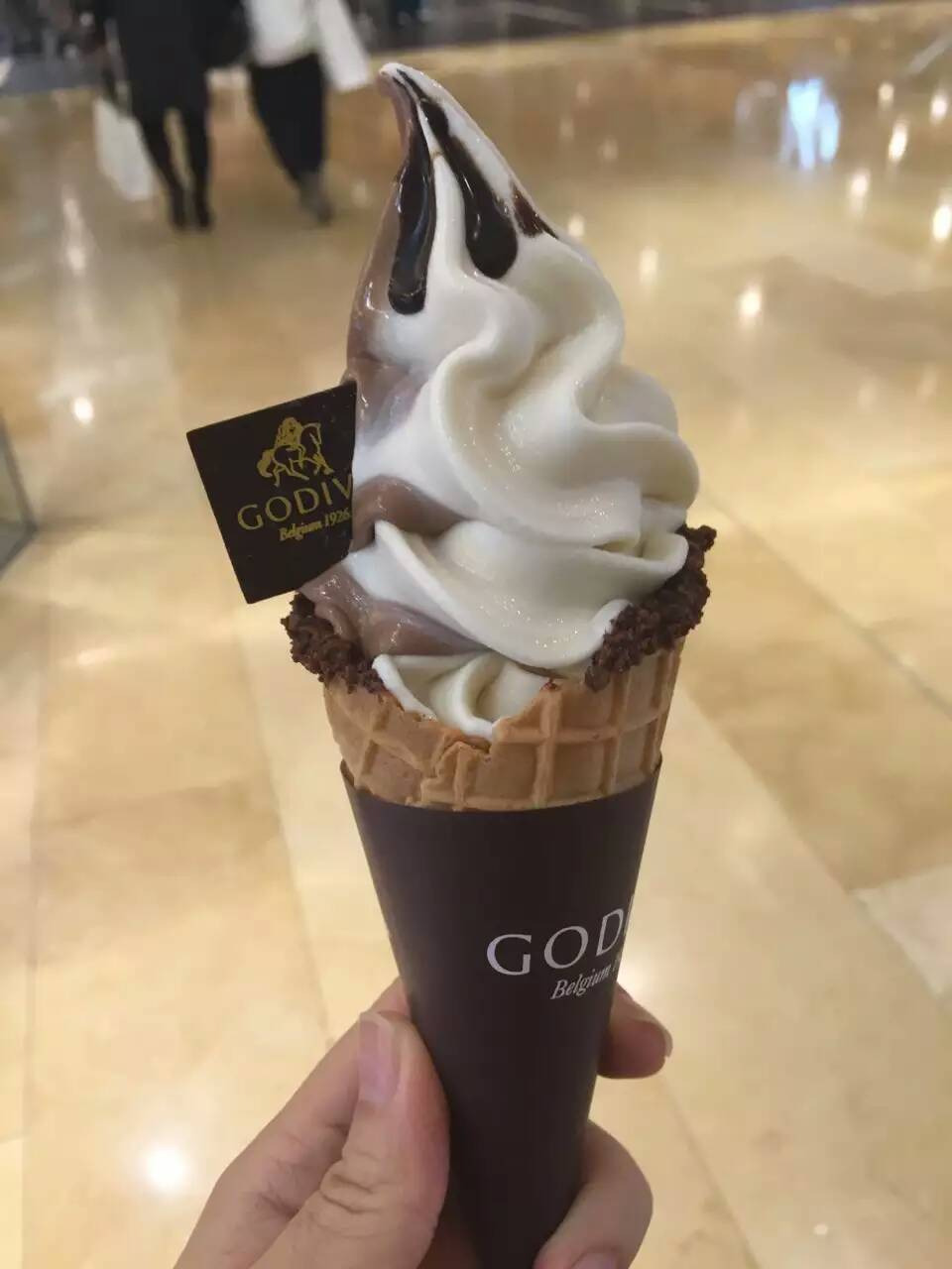 GODIVA最便宜的就是这个甜筒型的雪糕,奶味非常浓郁,而且口感很丝滑,雪糕融得很慢,巧克力比较浓稠,可以拉丝了,而且微甜中带点苦味,非常好吃的经典组合。甜筒是脆脆的,非常薄,有点小麦的香味。这家店人气很高,需要排队购买,虽然人多,但出品很快,真的值得排队尝一尝的。