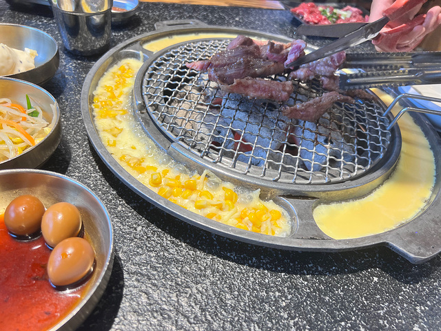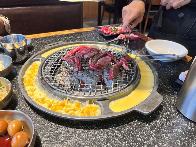 来到韩国街玩吃什么呢,是吃韩式炸酱面还是烤肉,还是酱蟹、部队锅?满脑子的韩国料理😋查了一下点评,排名靠前的都是烤肉店,在钟路商会和青鹤谷之间纠结了半天,最后还是选了在多年前吃过的这一家钟路商会,没想到这一家事隔这么多年仍然称霸韩式烤肉的榜单前三,可见他的烤肉还是在食客心中有一定说服力的。 我们没有点双人套餐,据服务员说两个人根本吃不完,因为里面有好多道主食。于是我就单点了三盘肉,调和牛小排,调和牛护心肉和猪五花,再加上老妈爱吃的石锅拌饭和海鲜鱼饼汤,以及店家准备的满满一桌子丰盛的小菜,和锅子两旁带着一起烧的炖蛋和芝士玉米,可谓是相当丰富了。 这里的服务挺好的,服务员都会主动帮忙烤肉,第一盘烤的是调和牛小排,这个味道着实惊艳到了,平时吃牛排也吃的很多,但一般都是山姆的牛排自己家烤,但是他这个牛小排特别特别嫩,汁水特别丰富,搭配着紫苏叶和一些韩式泡菜包起来一口塞到嘴里,那是相当的满足。总的来说可以给到四星半以上👍