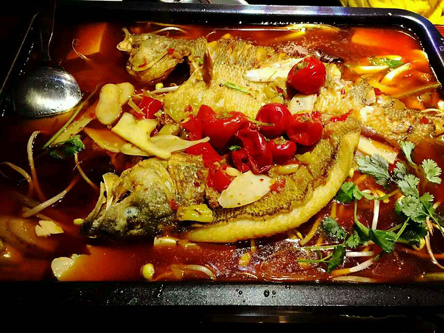 辣味十足的烤鱼。这里虽然人齐没有探鱼炉鱼高,但是出品也是杠杠的。这里使用的辣椒种类不算多,但是辣味很够,而且这里的烤鱼上菜很快,端上来是已经烤好的鱼,可以马上开动。鱼有被切了几刀,酱汁的辣味渗透到鱼肉中,没有吸收酱汁的鱼肉也很鲜甜。这里的就餐环境一般般,非常吵杂,桌子间距很小。