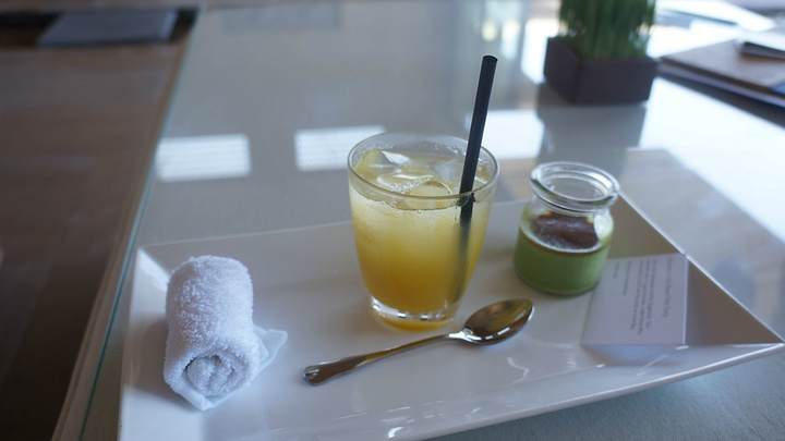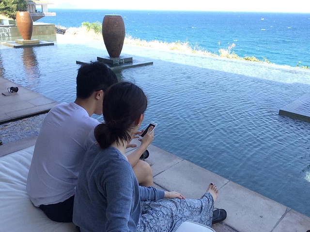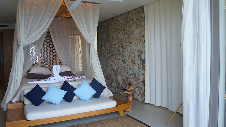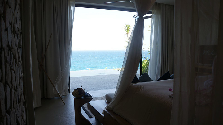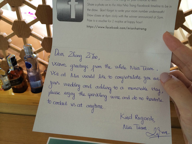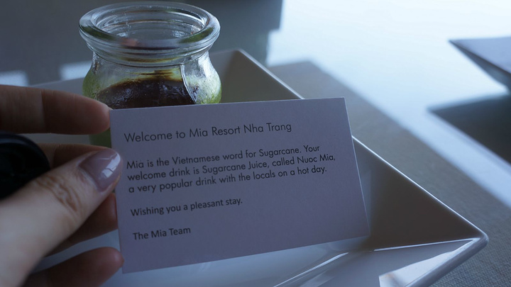 虽然在飞机上看vinpearl看到快流口水了,但最赞不绝口的酒店还是我们今晚入住的这家! 给人的第一印象就是浓浓的海洋风情,在半露天接待处办理入住手续那一刻就是非同凡响的体验呐。 蓝天白云,视野开阔,海风习习,一片蔚蓝 因为想给男朋友一个生日惊喜,瞒着他偷偷定了这里。 Mia独占整片海滩,地处僻静,特别在人山人海的五一能享受到这种待遇简直是天堂。除了舒适亲民的客房(价格1500左右),还有特级的garden view和cliff view两种房型选择,价格方面自然也高出一点,我们定了cliff,一个字,好抵阿 作为生日惊喜嘛,我还提前Email了酒店帮我做蛋糕,在checkin的时候,前台还很识相的支走男朋友和我商议生日的事宜。 checkin完,再在我们一轮自拍快门之后,服务员送上了welcome drink,是清爽的甘蔗汁和抹茶红豆布丁,旁边还贴心的放了湿毛巾,是越南玫瑰的香气。 大堂离房间并不远,走路也就十分钟,就这么一段路还有专车接送真是棒棒哒,躲开炎炎夏日,只管轻松入住。
