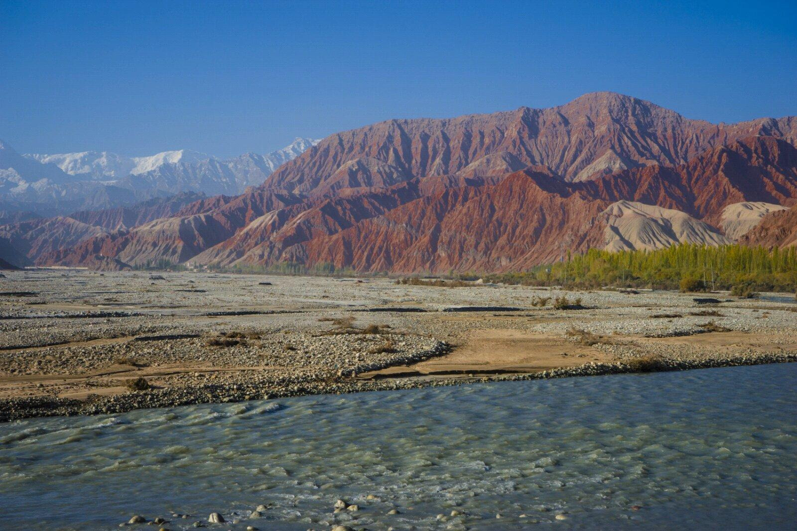 在红山前流过的是奥依塔克河,虽然不深,但是水流很急,滚滚而下的河水居然是灰色的。据说春夏两季河水非常大的,主要流淌着附近大山上融化的雪水,带下很多矿物质和石头,所以因此颜色变成这样。