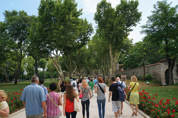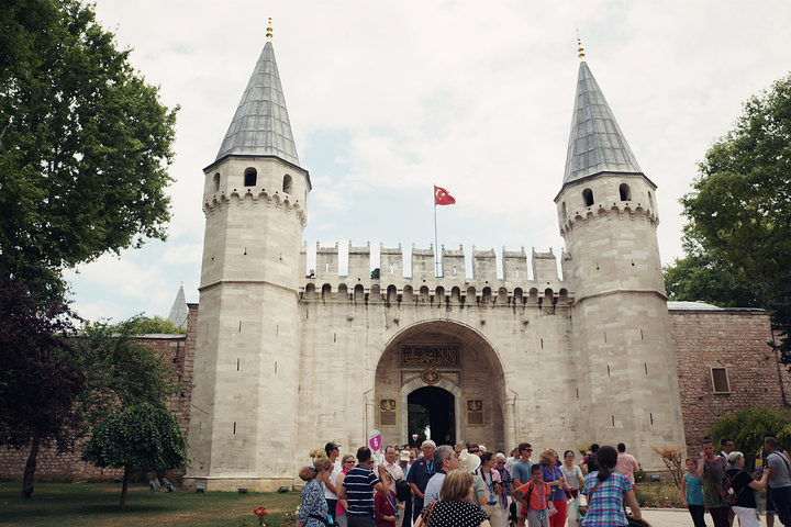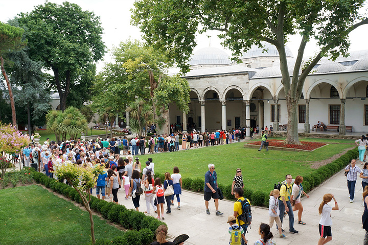 今天的第一站选择了托普卡帕宫 因为这个奥斯曼帝国的正牌老皇宫几乎是旅游团的必到景点 而宫里面必看的珍宝馆为了控制流量是需要排队的 如果去的晚 你懂的 新老两个皇宫我只去了这个老皇宫 会这么选择一是因为我们时间有限 不想每个地方走马观花 而是要细细品味 二是老皇宫就在老城区里 步行可至 实在方便 三是新皇宫虽然装修的奢华精美 但整个欧洲比它奢华精美的皇宫多的是 而老皇宫才是奥斯曼的根 是帝国精气神的所在 四是因为那颗全世界最大的钻石 93克拉啊 不见识一下无法理解土豪这个词 老皇宫的位置就在索菲亚大教堂的东北方 大概再走3分钟就能到达 如果方向感不好的童鞋 多问问路就好 宫门还是挺高大的 而且那么多的人头 绝对不会错的 皇宫的票价是30TL 我们昨天买的MUSEUM PASS可以直接入园 不过后宫需要另外买票15TL