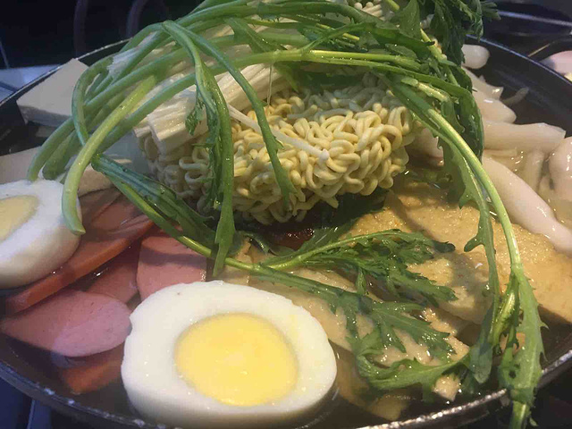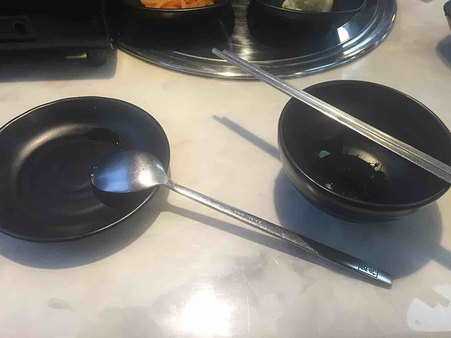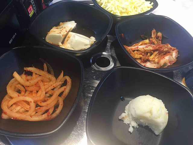 因为上次来他们家吃过一次烤肉印象还不错所以这次来尝尝他们家的年糕火锅。和小伙伴两个人来的,中饭吃多了所以晚饭吃一个部队锅也差不多。他们家的店面其实在二楼,一楼就只有一个楼梯。整体的餐厅设计有点暗,灯光闪烁有点韩国style。服务员服务也算积极,主动配合点餐。他们家的菜单东西不多,出来年糕火锅就是烤肉,肉是三盘开烤的。还有大酱汤,拌饭,炸鸡之类的几样熟食。几叠小菜是送的,每个客人还给了一碗南瓜粥,小菜的味道还不错,我特别喜欢那个土豆泥。但年糕火锅的味道着实让我对他们的菜品失望,还是建议来吃烤肉吧。年糕火锅里面的料很少,萝卜洋葱之类的辅料却很多,味道没有惊喜还偏辣。水加得很多都要满出来了,感觉自己在吃一锅的草。另外加了一碗芝士,加入以后由于水多完全都没有奶味了,总之是很失望的一次体验。交通:991、993蔡陆专线均可到达曹路宝龙。人均消费:年糕四十,烤肉90。推荐烤肉。住宿:附近新开的五星宝龙丽笙还有三星泰吉大酒店,另外还有一些民宿。