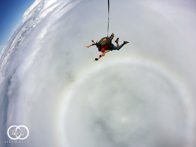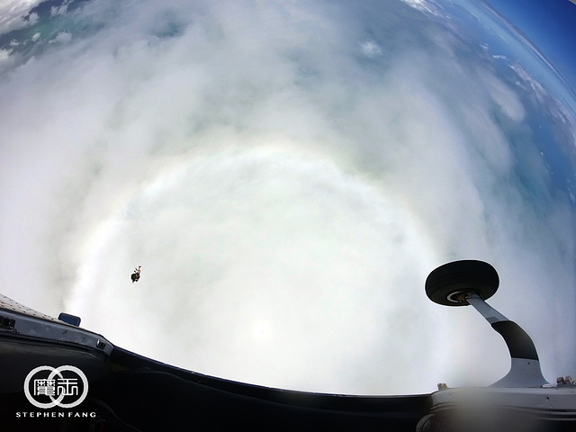 准备跳下飞机时看到飞机底下有个巨大的光环,我一直以为是我的护目镜脏了,后来拿到照片和视频才发现这个光环是真的存在的~ GoPro的广角让画面看起来是球形的,感觉像是要从宇宙中跳进地球。