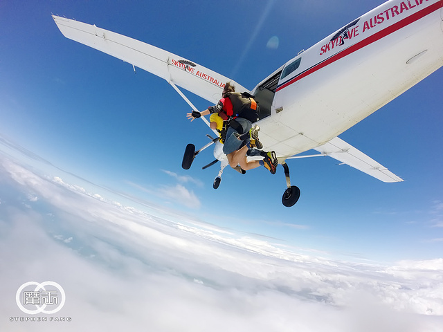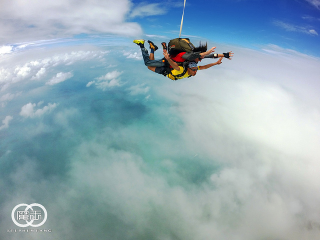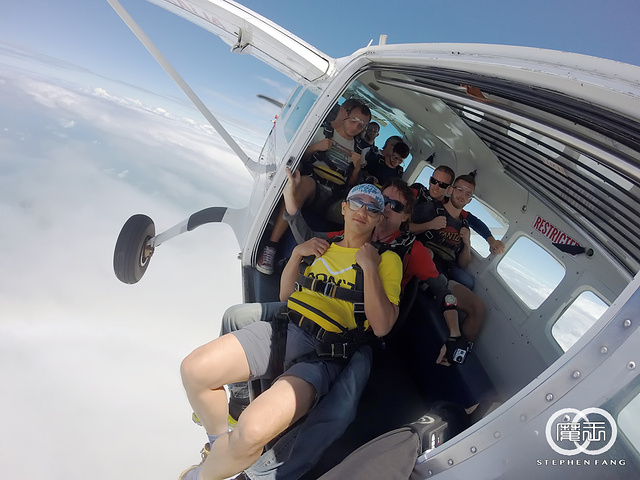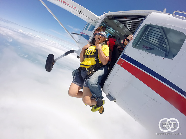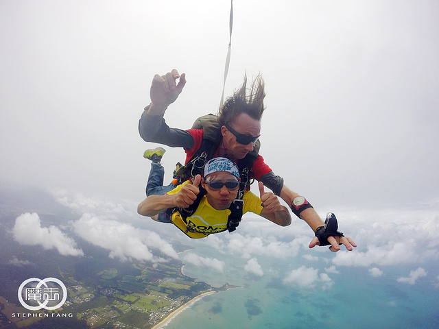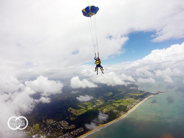 一直以来就很想尝试一次跳伞,知道要来凯恩斯时,毫不犹豫的把跳伞列入必参加的项目之一~ 我选的是使命海滩(Mission Beach)跳伞,特色是在海上空跳伞,比在凯恩斯市区能看到更多的海岸线景色。 使命海滩在凯恩斯南方大约2小时车程,出发当天早上6:30集合,但是天气情况不太好,断断续续下雨,而且每次雨势都不小。 想起昨天去翡翠岛船上遇到一个韩国人说他前天在使命海滩等了半天都没跳成,中午被送回凯恩斯市区,虽然退了钱但没能跳成总是遗憾,在车上认识了几个也来跳伞的马来西亚朋友,说他们昨天就来了,轮到他们时,装备都穿好人都准备上飞机,结果天气突然转坏,也没跳成。。。。。 望着窗外的雨,在心里七上八下中睡着,醒来已经到了跳伞公司位于使命海滩的办公室,雨停了但是云非常厚。。。。 跳伞公司的工作人员说明我们还是要等天气转好才能跳,一伙人只能在发呆看天空。 等了大概有一个多小时候,工作人员突然开始喊名字准备跳伞,前两轮都是昨天没跳成先跳的,我事先不知道自己是第几轮,只能等着工作人员叫我名字。 第二轮出发没多久,工作人员开始喊第三轮名单,居然喊到我名字了。我被带到装备区,这里有块电子显示屏,上面有每个人的名字和带你跳伞的教练的名字,我的教练叫Dave,他一看我的名字就像个中国人,不用喊就直接找上我了(这一轮只有我一个亚洲面孔)。 沟通下简单的动作要领后,Dave对我说,别紧张放轻松就好,我告诉他,我不但不紧张还很兴奋。 装备穿好后我们上了去机场的车,车又往南走了三十分钟,更糟的是,这时候天空又开始下起大雨!!!到了机场,果然被告知又要等。 大家在车上昏昏欲睡,我则是担心会不会像马来西亚朋友一样,都要上飞机了结果被取消,我心里在吶喊,不要阿~~~~不要阿~~~~~ 又等了十五分钟后,突然雨停了,我们被催促着上飞机,才刚刚坐好飞机就转向跑道起飞。话说,这个小飞机还真是简陋,有位也跳过伞的朋友说,这根本就是拖拉机好吗! 飞机起飞后不断在爬升,机舱不是密封的,外面的冷风不断透进来,当然也没有空调之类的东西。飞机越飞越高,我觉得越来越冷,抬头一看机舱上有个高度计,旁边还有三个灯,大约还记得黄灯亮表示还有五分钟,红灯是还有三分钟,绿灯则是可以跳了 这时我看高度计上显示才7000英尺,离预定要跳的高度14000英尺(大约4000米)还有一半距离,我问Dave大概还需要多久才能到跳伞的高度,Dave说,飞机飞二十分钟到预定地点,跳伞全程五分钟,包含第一分钟的自由落体。 飞机飞到了大海上空又穿过一片云层到了云层上方,这时黄灯亮,教练们也开始准备,帮我再检查了所有的装备和扣环是否固定好,然后,红灯亮,我的心里依然很平静,绿灯一亮,机舱们门一打开,第一组立刻跳了出去。 轮跳的速度很快,马上就轮到第四组的我,Dave让我把脚伸出机场,问我是否OK?我回了他一个OK的手势,他就带着我跳出飞机啦~~~~