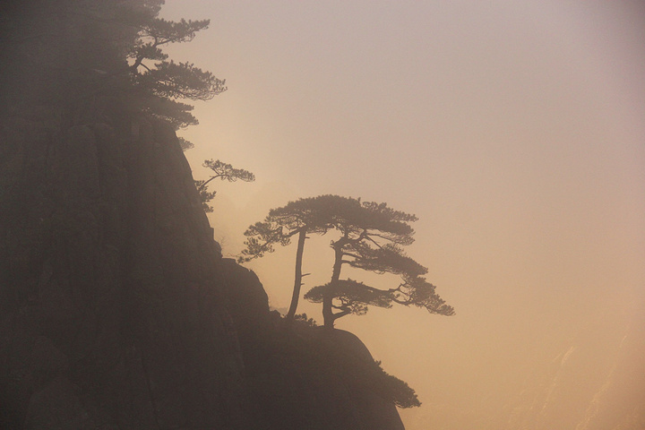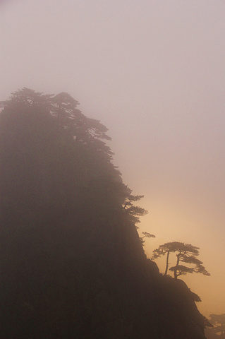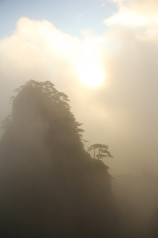 正是日出的时候,阳光偶尔穿透云层,就有了着仙境的金光 不偏不倚,正好打在这颗半山腰的松树上....
