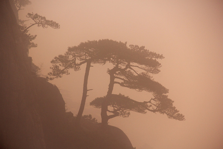 正是日出的时候,阳光偶尔穿透云层,就有了着仙境的金光 不偏不倚,正好打在这颗半山腰的松树上