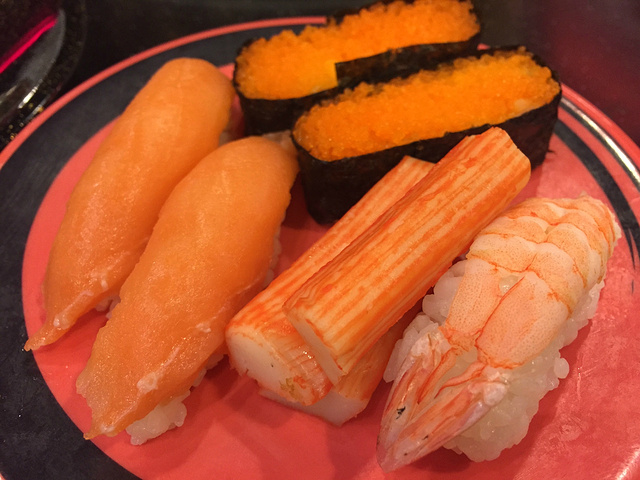 回转转盘上的菜品种类也很多,但是每盘的量很少,食材都很新鲜。鲜咸味特别明显,我们连吃了好几盘