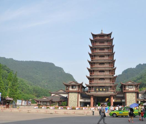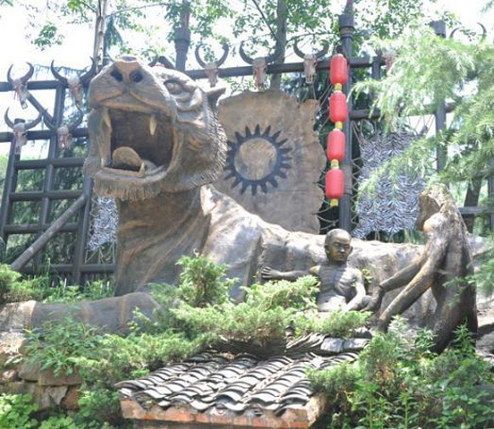 吃完中饭,就来到了袁家寨,袁家寨子秉承着土家族建筑的特色,寨门檐角向上翘起,进门之后一只猛虎横卧于前,一个孩子和一只巨猿坐在旁边,这是土家族的图腾