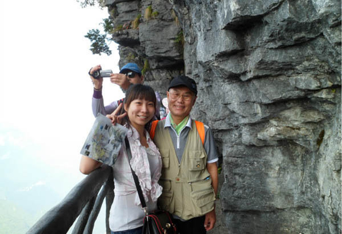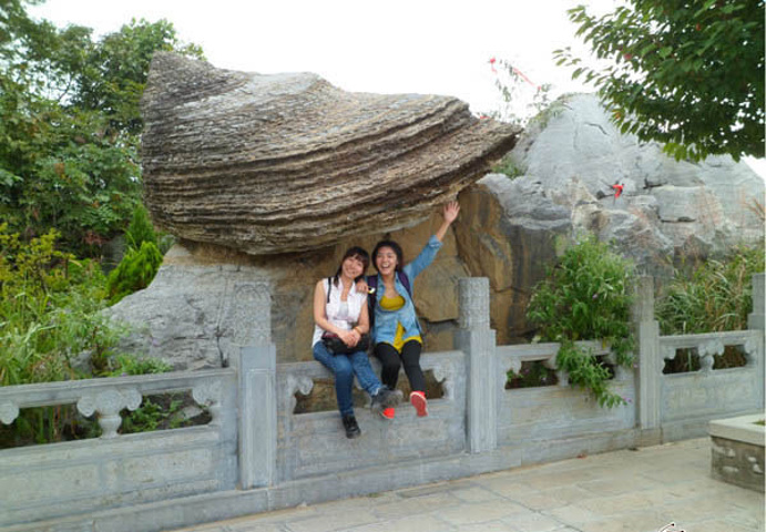 海螺石 天然形成的,很奇特吧,还有合影。 在这个时候呢,位于我们旁边拍照的三个人和我们有关了。因为我们不走东线,是从西线的鬼谷栈道走上来的,还有一条道就是森林小缆车了,如果我们不选择缆车下去的话就要原路返回。正在我们商量时,旁边的三人其中有一个男士听到了,跑过来对我们说他们有票,他们是买的往返票,坐上了但是想走下去,所以票就用不了了,刚好听到我们说话,想着送给我俩。把我俩激动的,刚开始我们不要,后来他们三人商量好了就把票给我们了,真心觉得运气不错啊。