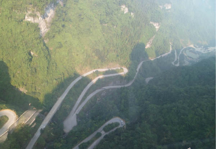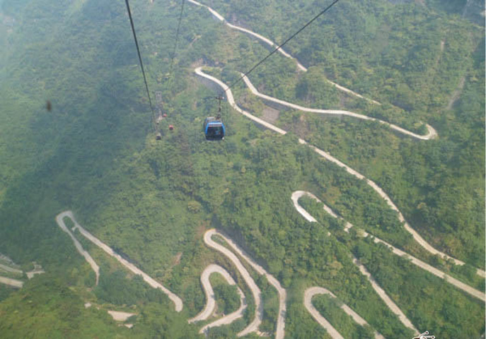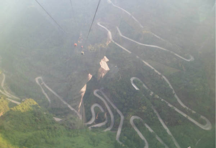 索道上拍的99道弯 索道带着我们跑了好远,这个速度还是不慢的,但是感觉很不错,就是一直在上。中间有个索道中站,开一下门,可以在中站下的可以,但是因为是上午时间所以不建议在中站就下。景区的服务人员在上午也是不建议游客从中站下去,但是下午来的游客都是从中站下去,然后观光车上到天门洞,再从索道上站一路坐索道下来。而我们刚好是相反的。 为时将近半个小时,索道到达上站。