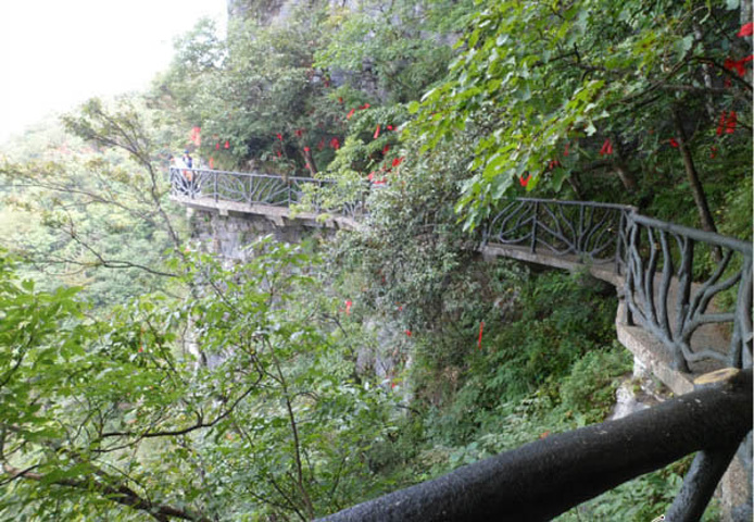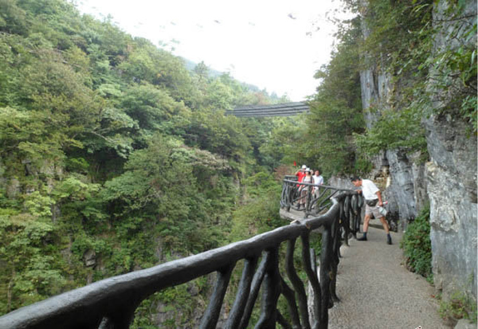 很温馨的感觉 瞬间觉得充满了人文气息。 从这里一直向前,不一会就到鬼谷栈道的入口处了。鬼谷栈道就建立在崖壁上的一条窄道,适合观光,也比较惊险,有恐高的童鞋们还是不要尝试的好。鬼谷栈道,向左 同时这里也是一个照相点……有些意见还是保留的好