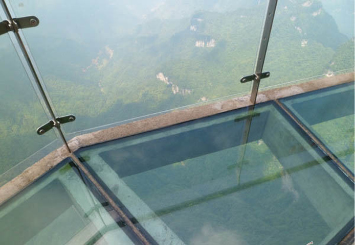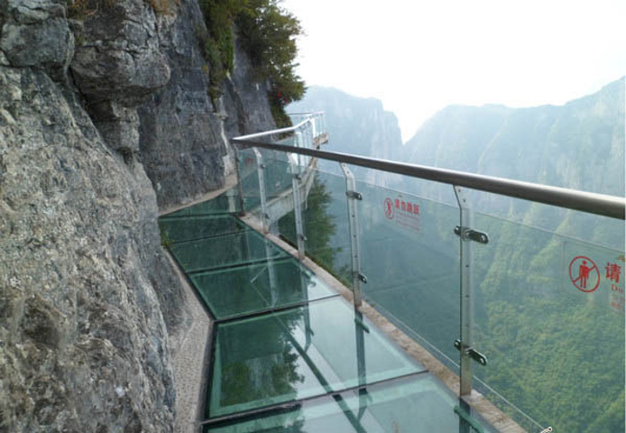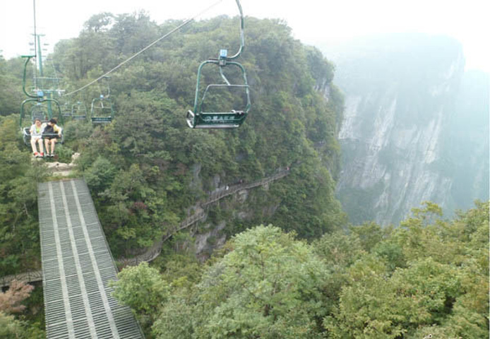 从云梦仙顶的大观景窗看到的 从云梦仙顶有森林观光缆车,和上山下山的索道不一样,这个路程短,而且是镂空的。乘坐这个可以直接到达天门山寺,但是是要额外收费的,可以单程也可以往返,决定先步行,于是我们沿着旁边的指示进入觅仙奇境区,最后到鬼谷栈道的尽头,从鬼谷栈道一直往上也可以步行到天门山寺。