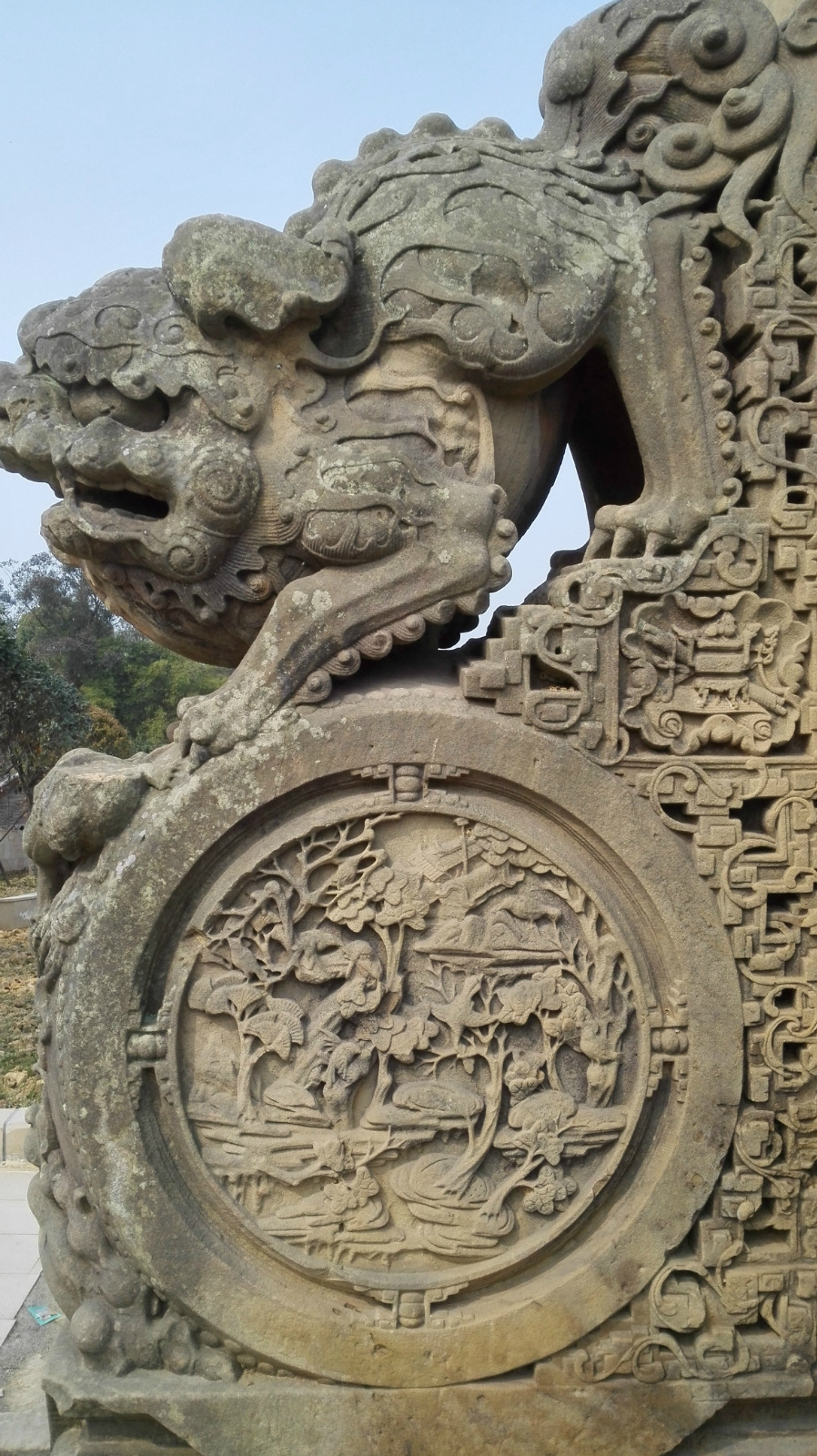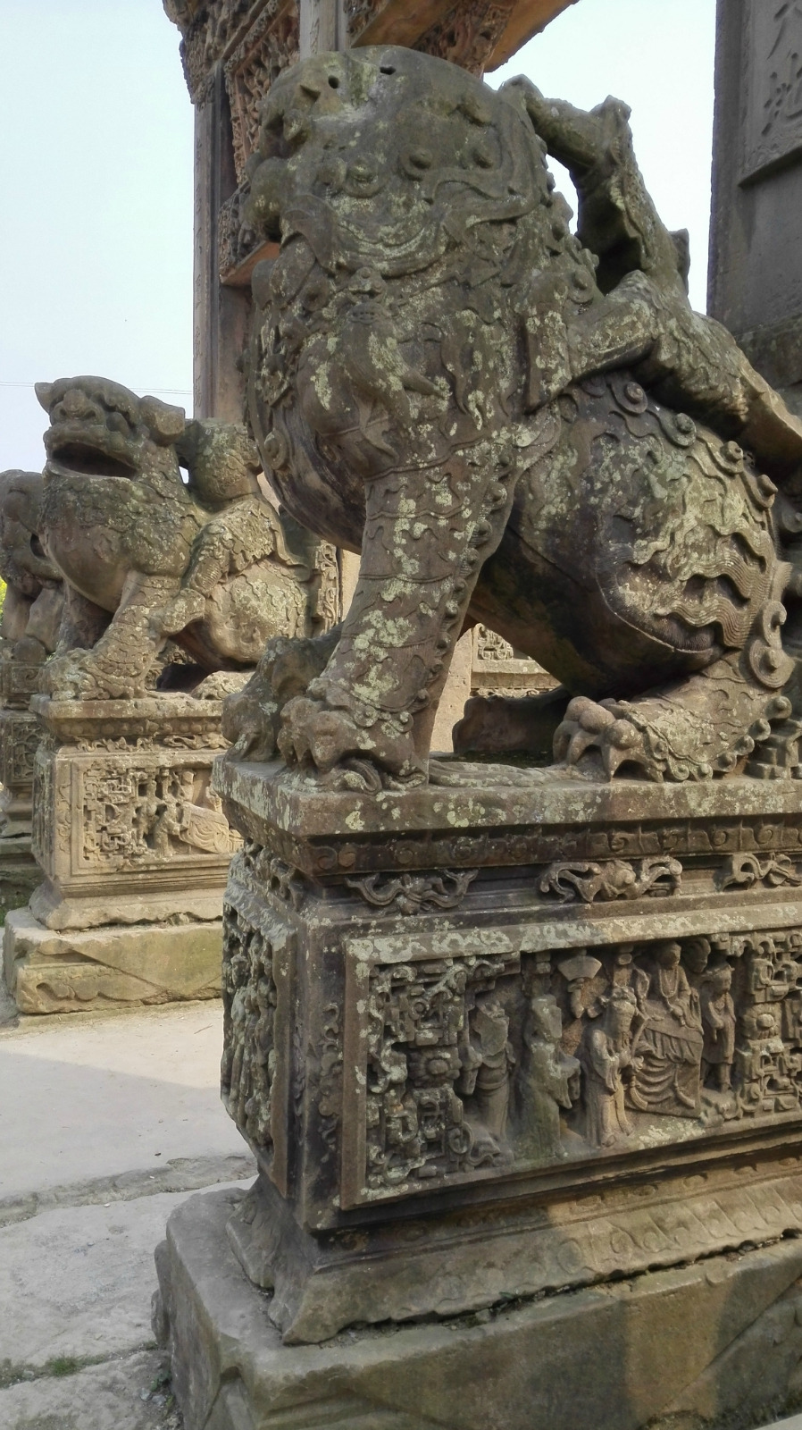 保存完好。雕刻精美。连石狮子下面的石墩四周都雕满了各种图案。而且这里现在非常原生态,无人管理和保护。我们去的时候,当地村民的小孩直接就爬到石狮子上去坐着在玩。