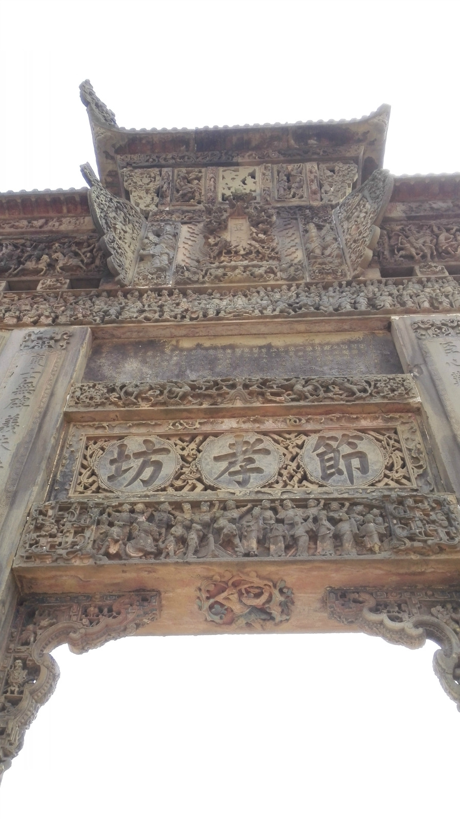 节孝坊,是清王朝表彰杨氏"夫死从子"及孝敬老人。刻有大量戏文和民间故事造像。节孝坊三个字上面还有“圣旨”二字。还刻了所表彰之人的事迹。不过因为刻得太高了,具体的字不太看得清楚了。