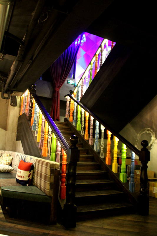 楼梯的栏杆漆成了彩虹色,黄绿橙红紫蓝黑,看起来充满少女心。