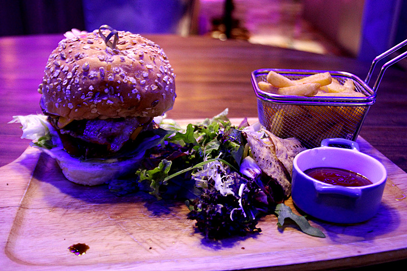 点了招牌牛肉汉堡,码子蛮大的。里面有一块牛肉饼,培根,生菜,洋葱。汉堡胚处理的不是很好,但是用料够足,旁边搭配的薯条和蔬菜色拉,还有两片墨西哥玉米片。薯条配的番茄酱不错,不会很甜。