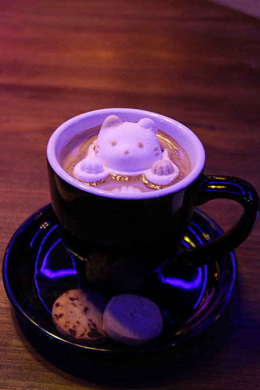 萌猫摩卡配了一块蔓越莓曲奇和一块黄油曲奇。造型师立体3D的猫头造型。但是不是拉花而是棉花糖。外貌协会的菜。