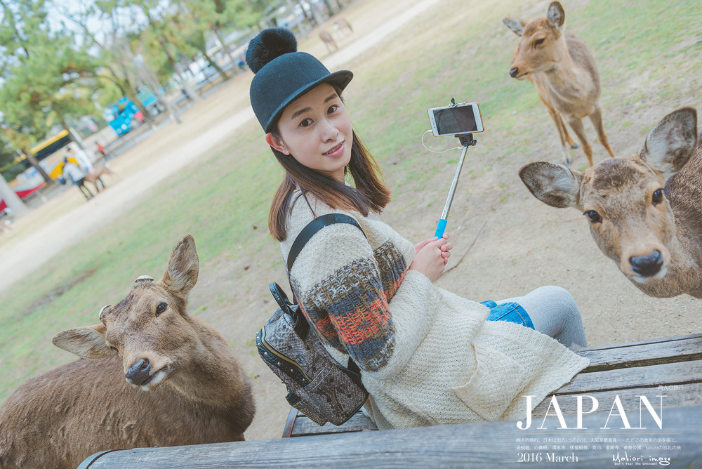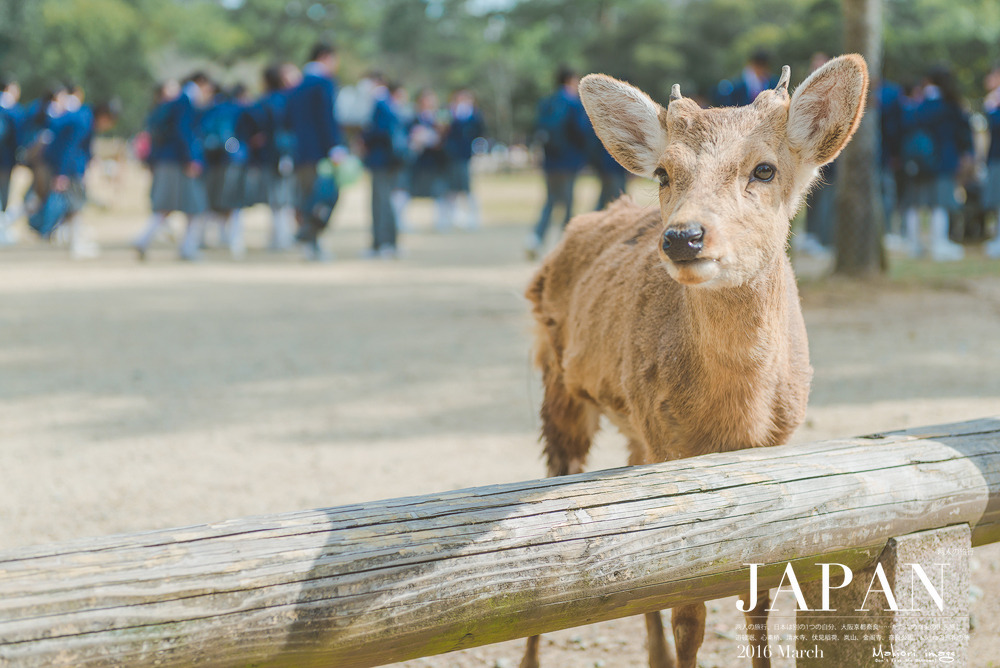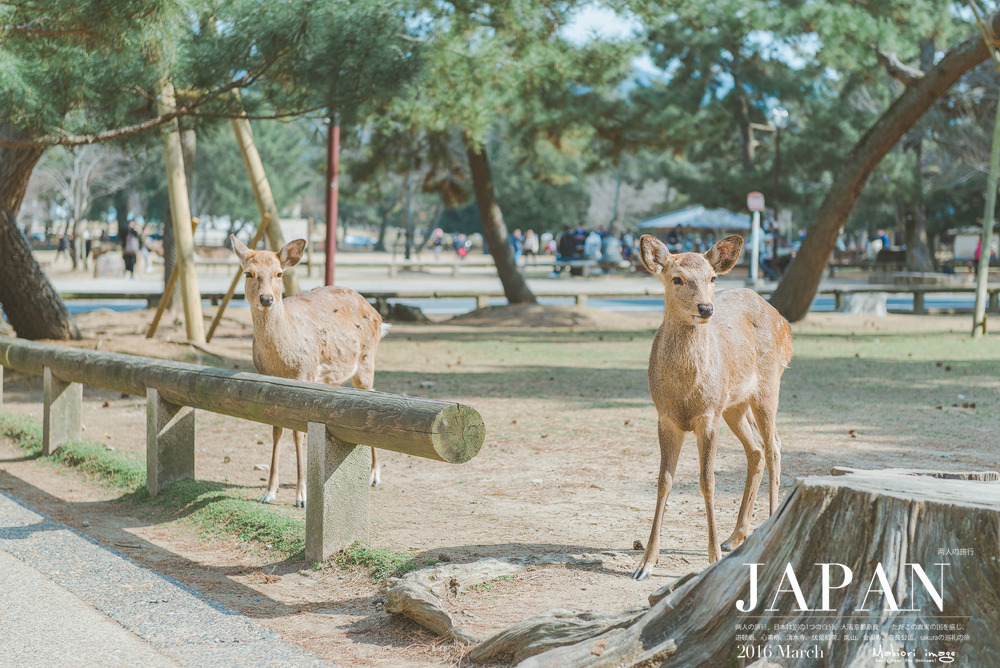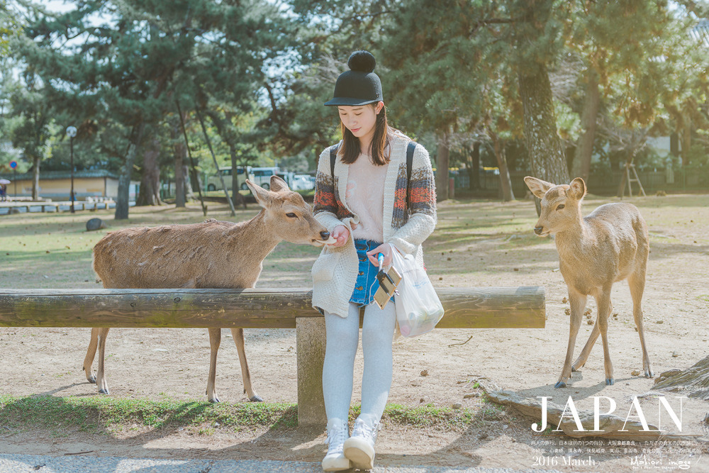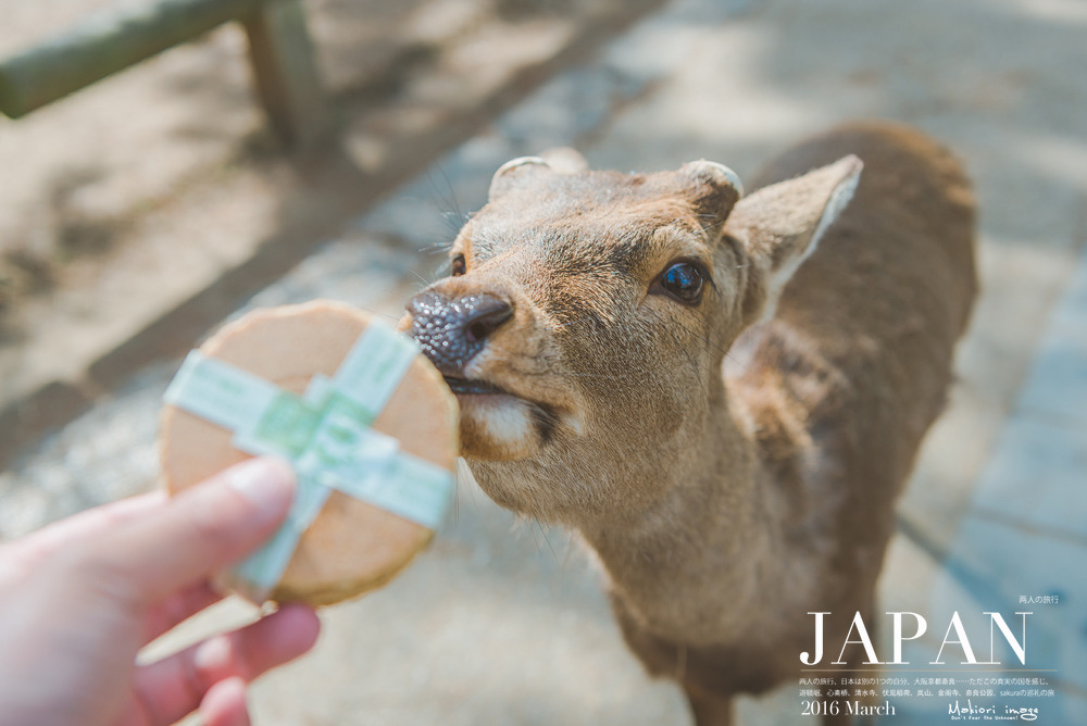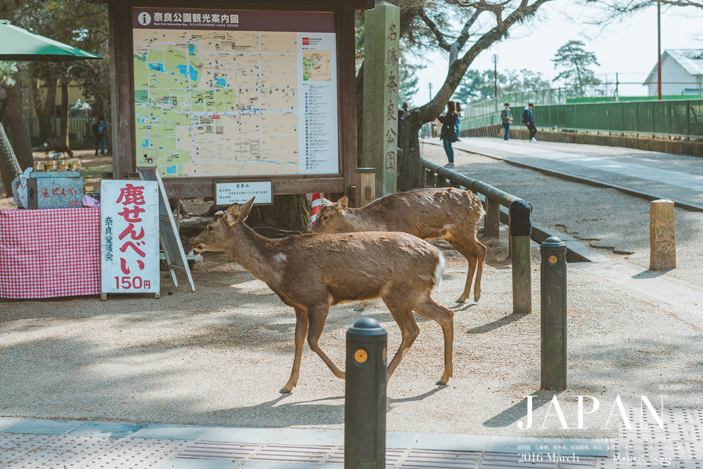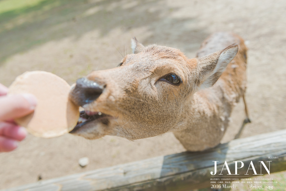 然后,我们买了2包鹿饼,坐在道路两边的木梁上,果然两头萌货就跑了过来要吃的