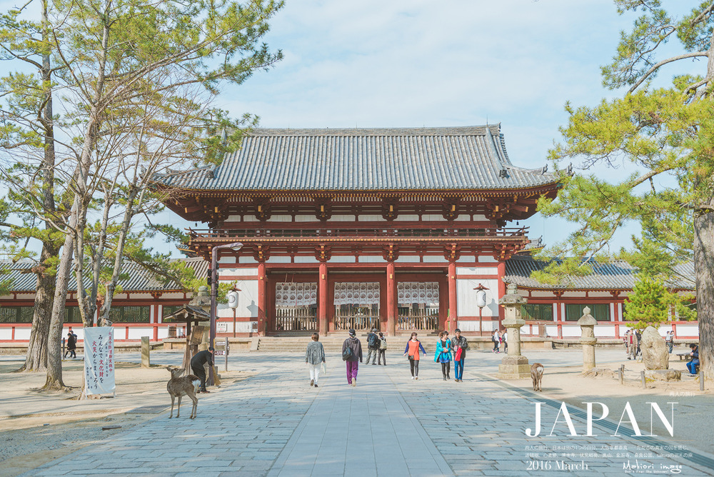 奈良公园附近就是东大寺了,又称大华严寺,是752年,圣武天皇为了祀奉大佛并作为日本寺院的总寺而建的,是华严宗的大本山。两次火灾烧毁了建筑,现在的是1692年重建,为原建筑的三分之二。 东大寺正佛殿,正面宽度57米,深50米,为世界最大的木造建筑。