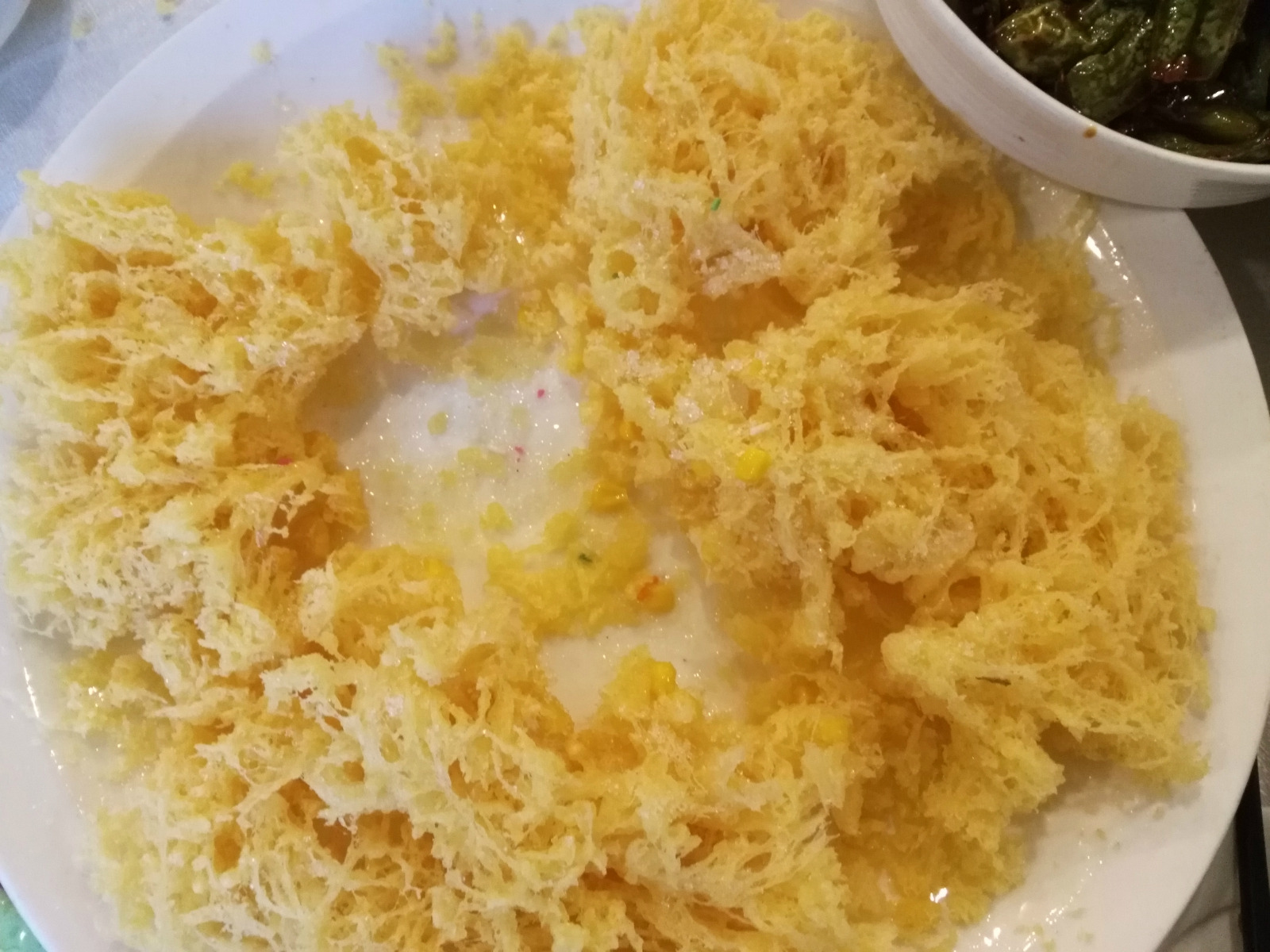 蜂窝玉米:脆脆爽口的金黄色甜点,里面有甜玉米粒,加了糖。非常大一盘,但这个不饱肚子,吃得很有情趣。