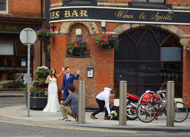 一对拍婚纱照的新婚夫妻,向路人微笑着招手,他们也成了我们镜头中的景色。