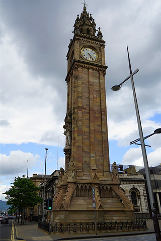 市中心皇后广场上有一座玫瑰红色的钟塔,落落大方的塔身显露出英伦沉稳典雅的气质,两只威严的雄狮伫立两侧,让我们相信,它曾经的主人是皇室。 这一著名建筑物是阿尔伯特纪念钟,建于1869年,为纪念维多利亚女王丈夫阿尔伯特亲王。它高35米,是法国与意大利哥特式风格的完美融合。由于地基不稳,塔身现已倾斜一英尺左右,被当地人叫做“贝尔法斯特的比萨斜塔”。又因钟塔样子类似于伦敦大本钟,故又称它为“贝尔法斯特大本钟”。