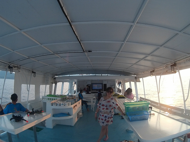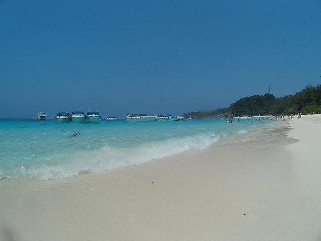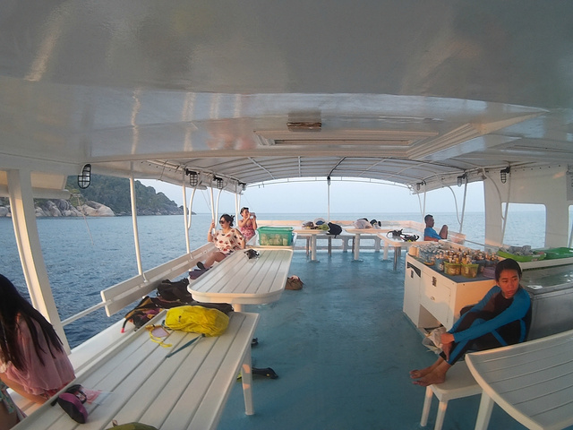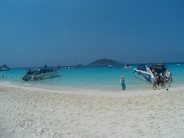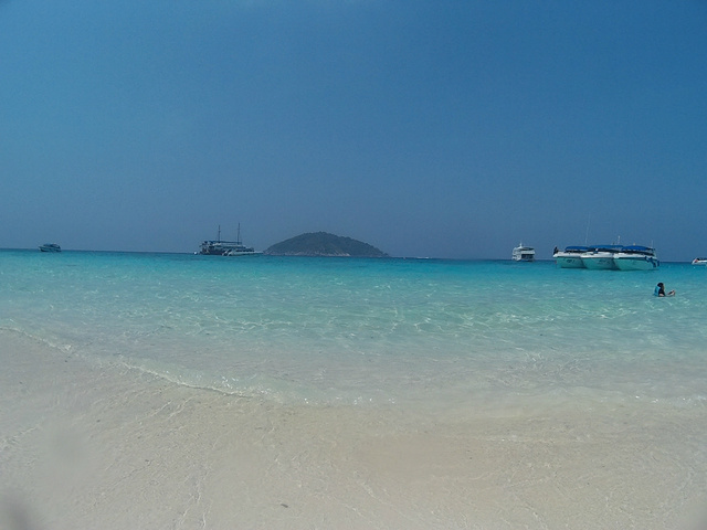 早上6点半,seastar的司机就在酒店门口等候我们,同行的还有一对外国夫妻和几个香港人。大概一个 半小时的车程到了寇力的seastar的船公司,seastar公司的服务果然很不错,早上有免费的早餐,品种比较丰富,也很符合中国人的口味,因为我们是2日游,在斯米兰过夜,所以大行李需要寄存在码头,带上一些必需品和浮潜装备就可以了。 大概9点半钟,乘坐四个马达的快艇出发啦~约一个半小时后达到斯米兰的5号、6号岛进行第一次浮潜,果冻色的海水,真是美哭了~ 中午在4号到用餐,很多团都在这进餐,不过好难吃。幸好我们未来的三餐是在seastar的船上吃。 吃完午餐后在集合地点找导游阿梦拿房间钥匙,我们分到一个很吉利的18号空调小木屋。岛上的环境很原生态,没有被过度开发,以至于没有热水,幸好带了水壶。 后面的行程就是浮潜浮潜浮潜~下午3点在岛上集合乘坐橡皮艇登上豪华大船,去7号岛浮潜和在船上享用晚餐,看日落。同行的朋友有的是住的船宿,有的住帐篷,其实原本我也想船宿,晚上在甲板上看星星肯定超赞,可是担心晕船就放弃了。 船上的晚餐是冬阴功汤、炸鸡腿、意大利面、鱼、青菜、西瓜、木瓜、香蕉、还有免费的茶、咖啡、可可非常丰富。味道比岛上好多了~ 晚饭后,静静的享受斯米兰的日落~