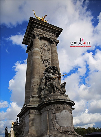巴黎的桥中最华丽的,无疑是亚历山大三世桥(Pont Alexandre III)。这座桥于1896 年奠基,1900年巴黎世博会时完工。当时为了纪念法俄联盟,故以沙皇亚历山大的名字命名。最大的与众不同之处便是它的雍容气派,桥上所有的装饰雕塑几乎都有讲究。桥身的一面塑有俄国圣彼得堡的城徽以及象征涅瓦河睡神的雕塑,另一面则是巴黎城徽与象征塞纳河的两个仙女雕塑,桥的两侧还装饰有水生动植物与花环图案。最为醒目的是桥两端各有两座高高的饰以浮雕的桥塔,两边伴有威武的雄狮,塔顶有分别象征着科学、艺术、工业与商业四组金色的飞马雕塑。为不影响两岸景观,桥的拱起弧度压得很低。