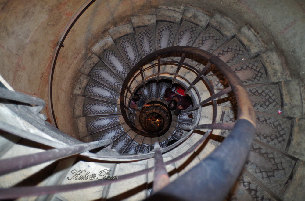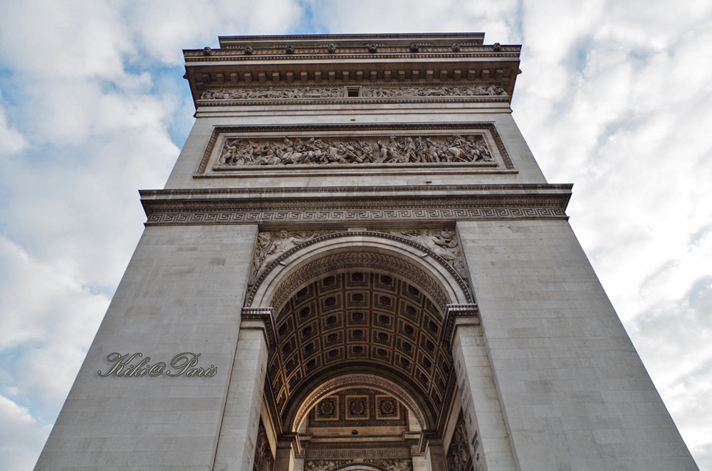 我们参观凯旋门的时候遇到了纪念活动。凯旋门前后门柱上有四个花饰浮雕,门内刻有386位随拿破仑远征将军的名字。沿着273级螺旋形石梯上去后可以看到一座小型的历史博物馆。博物馆的顶部是一个平台,可以俯视凯旋门下由环形大街向四面八方伸展出的放射状的大道。这些大道就象一颗明星放射出的灿烂光芒,因而,凯旋门又称“星门”。