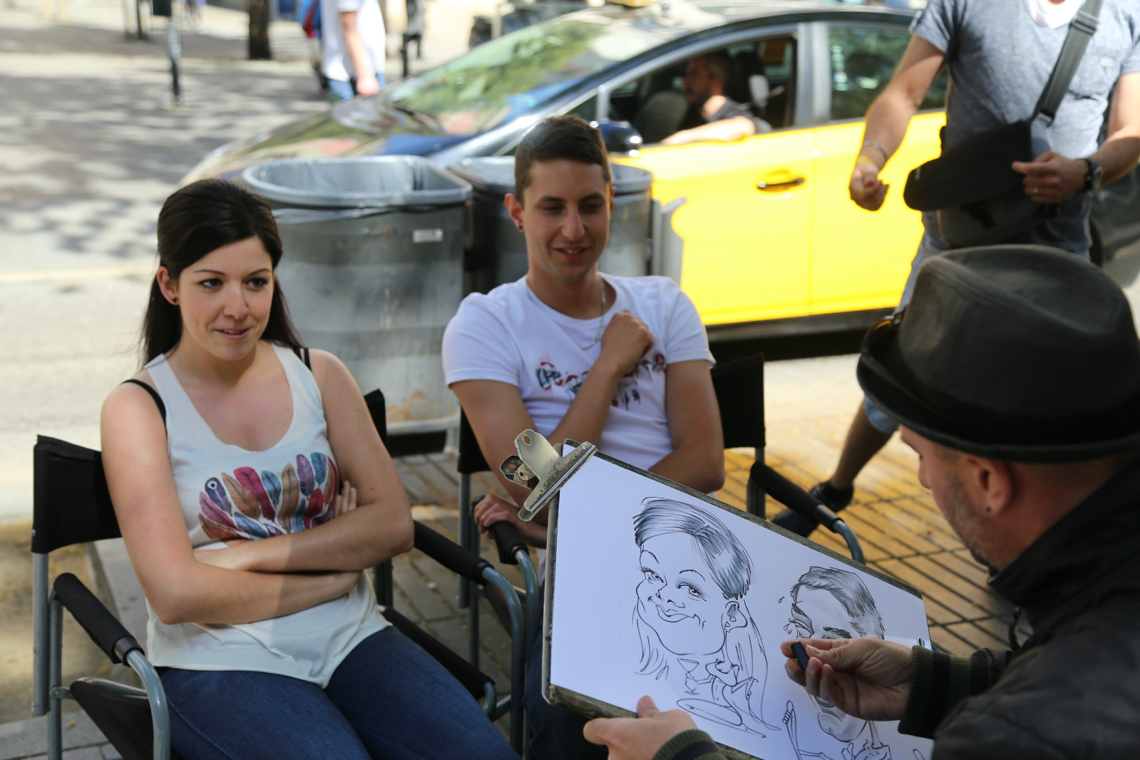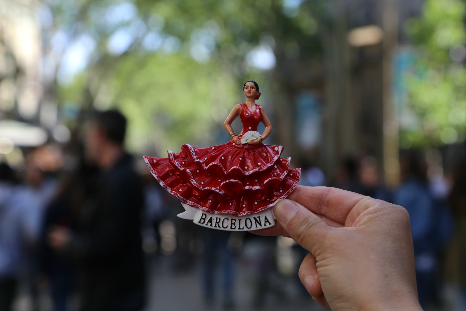 有人比喻兰布拉大街是一个露天大舞台,除了行为艺术、流浪艺人、还有街头艺术家的搞怪画像,一路走来,除了咖啡小馆,最多的就是出售各种纪念品的报刊亭和一排排缤纷多彩的花店,不过价格比较贵,一盆不起眼的植物,价格都在4欧元以上,我买了一个跳舞的弗拉明戈冰箱贴,3.5欧元,后来发现在别的地方,一模一样的只要2欧元,下次去,记住了,别在这儿买纪念品。