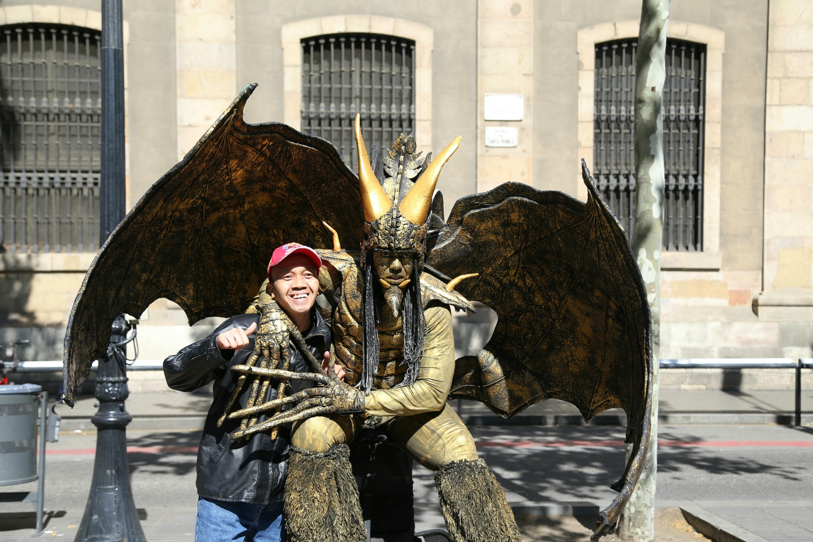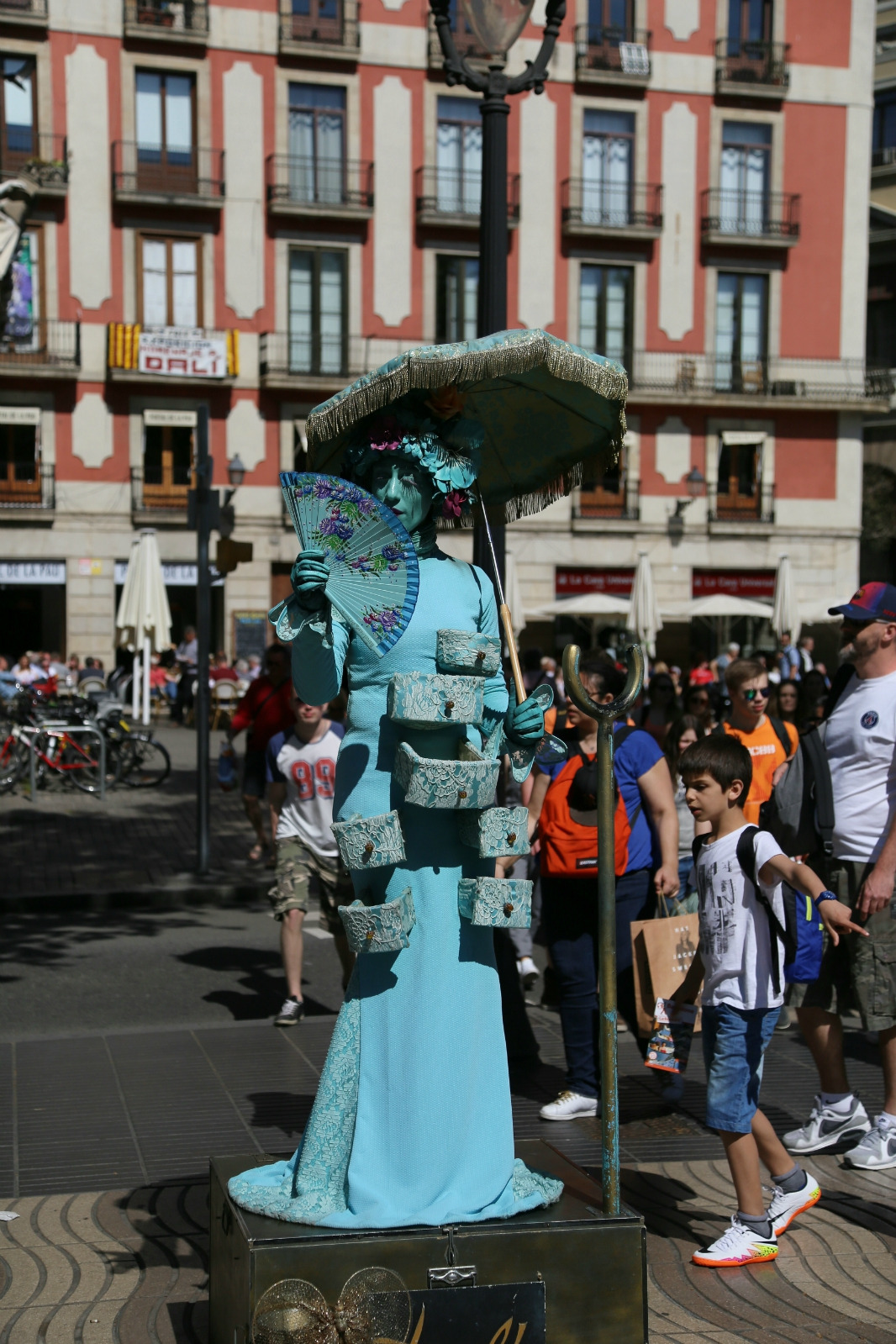 继续往前,穿过马路,就来到人声鼎沸的兰布拉大街,入口就看见街头艺人的卖力表演,各种乔装打扮,涂脂抹粉,让人目不暇接,在欧洲,这种街头艺人表演多了去了,早已见怪不怪,挑了一男一女匆匆拍了两张,哈哈。