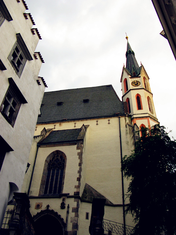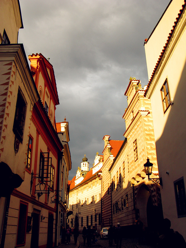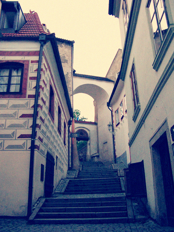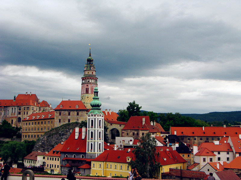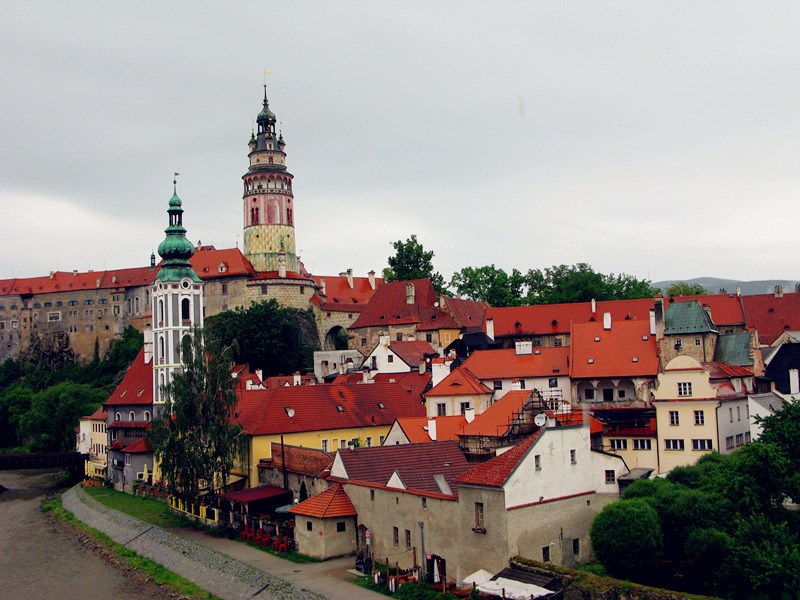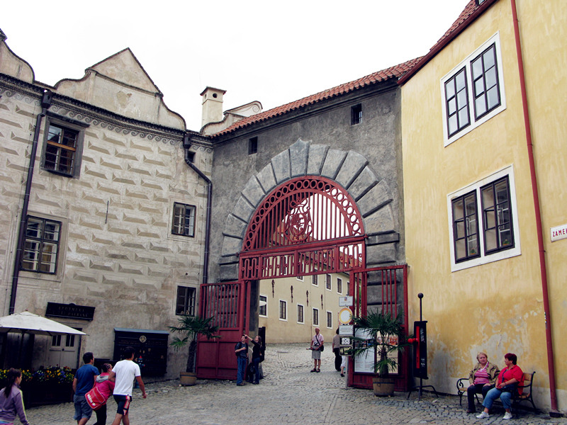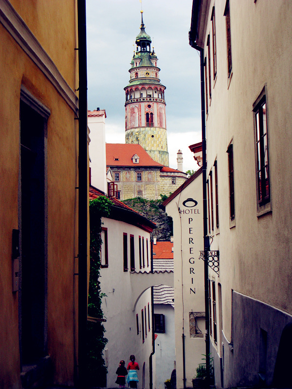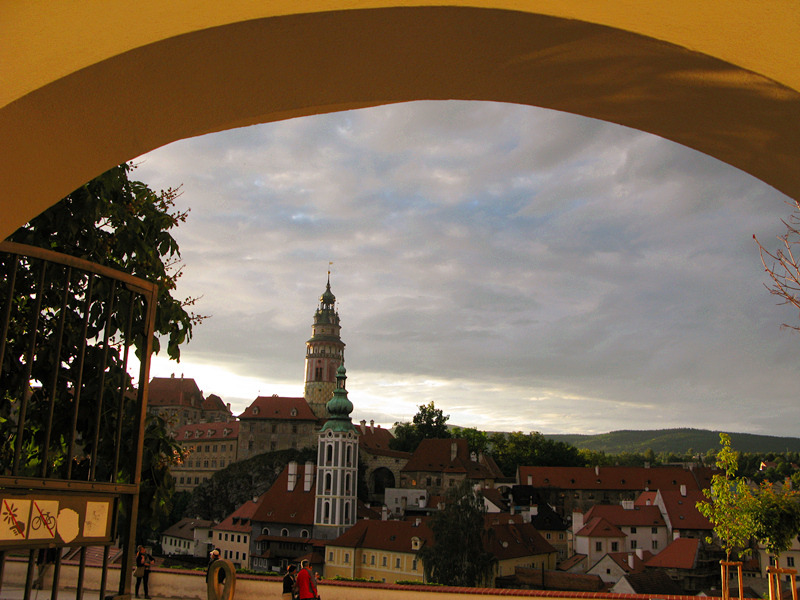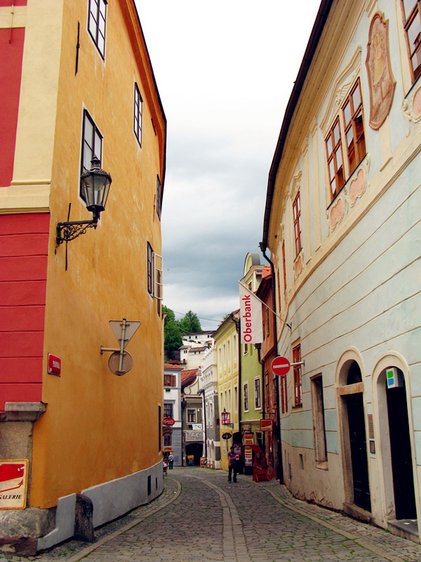 从一座古老弧形门洞里走进小镇,仿佛进入了童话世界,一条条狭窄的小巷,两旁都是色彩各异,风格独特的老房子,一家家形形色色的小店和餐厅门庭若市,可能是下雨的原因,小巷人不多,红瓦白墙的房子清晰地倒影在石板路上,慢慢地沿着河边边走边看,不知不觉地来到了小镇城堡,按照地图标记这儿就是彩绘塔了,仅次布拉格古堡的捷克第二大古堡。