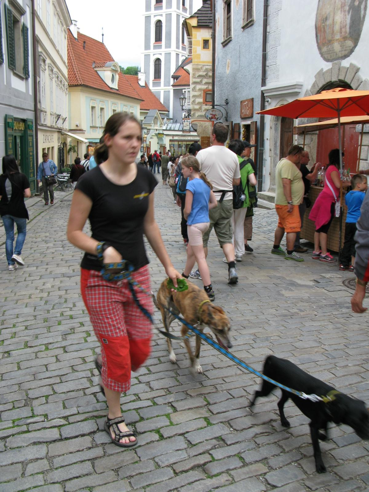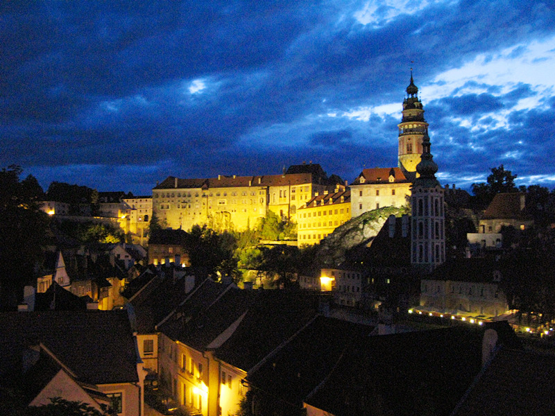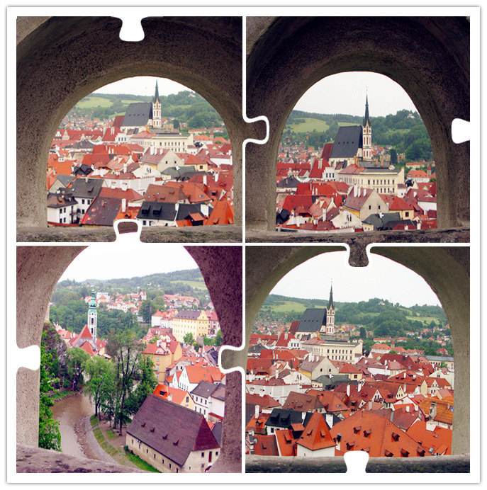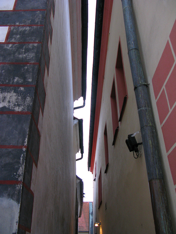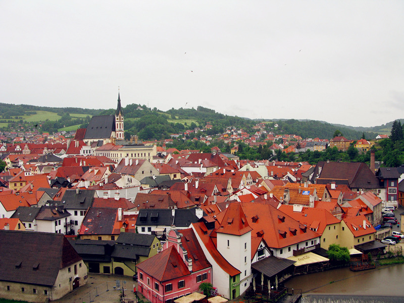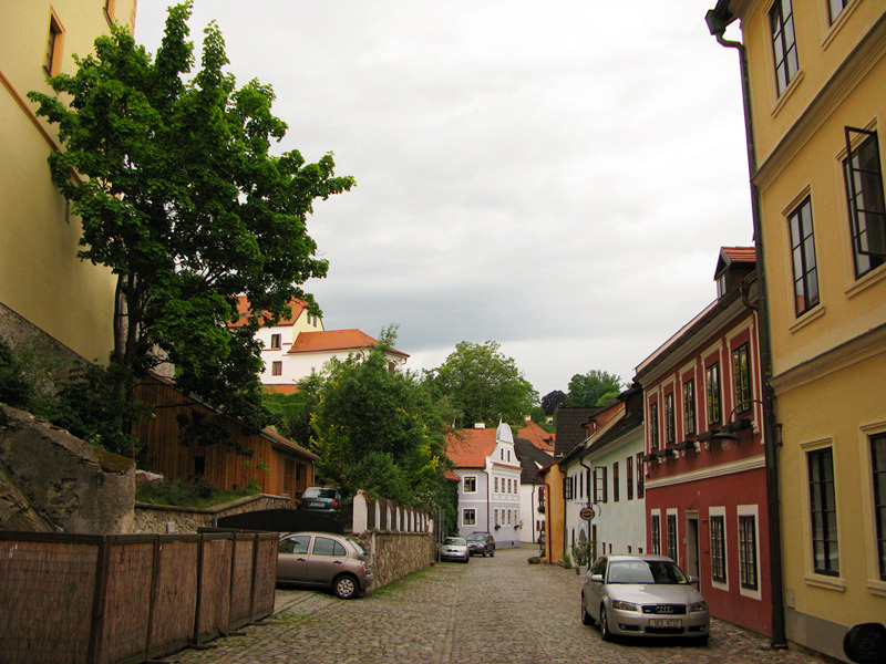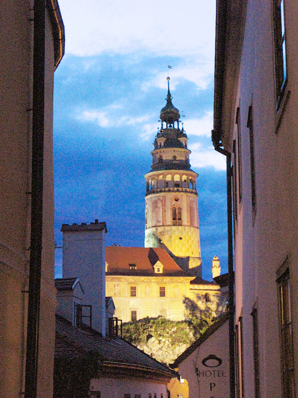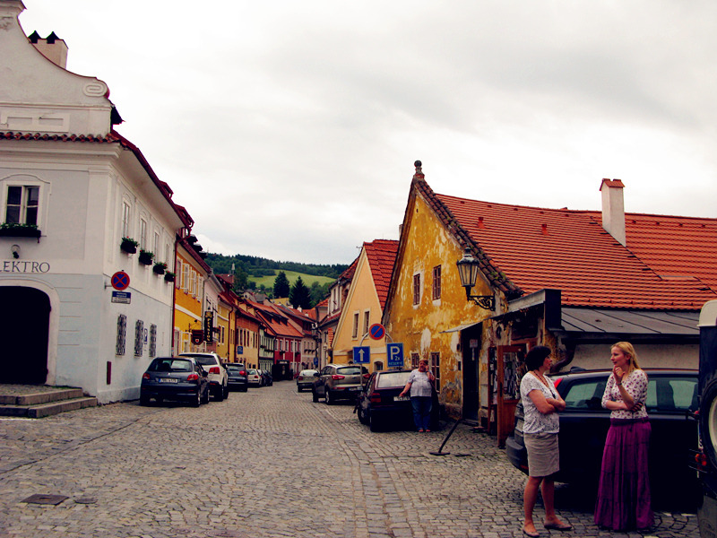从一座古老弧形门洞里走进小镇,仿佛进入了童话世界,一条条狭窄的小巷,两旁都是色彩各异,风格独特的老房子,一家家形形色色的小店和餐厅门庭若市,可能是下雨的原因,小巷人不多,红瓦白墙的房子清晰地倒影在石板路上,慢慢地沿着河边边走边看,不知不觉地来到了小镇城堡,按照地图标记这儿就是彩绘塔了,仅次布拉格古堡的捷克第二大古堡。
