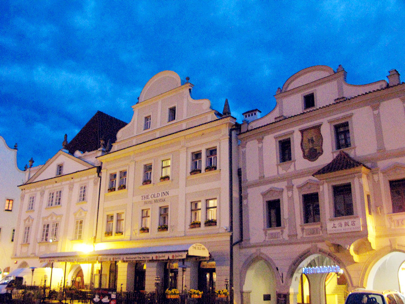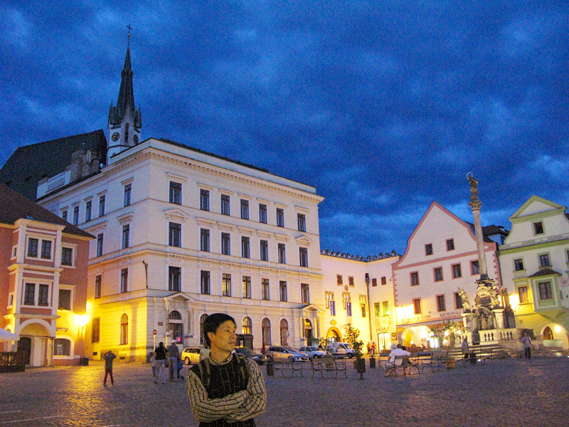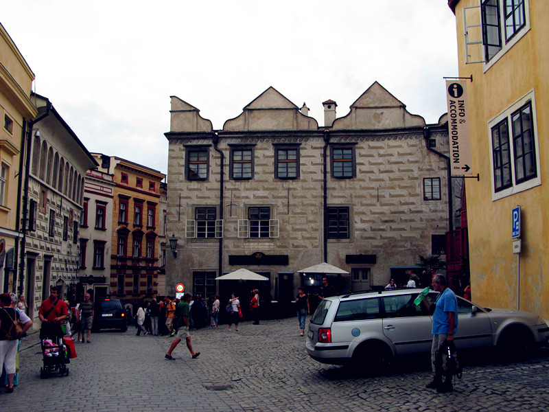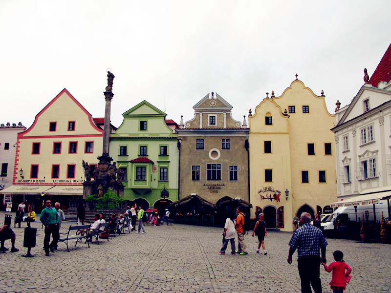 面的色彩,都充分表现了波西米亚人的浪漫,广场东南侧有一处喷泉和纪念黑死病逝者的圣像石柱,旁边白色的大楼是市政厅,墙上绘有文艺复兴纹饰,另外还有捷克的国徽、小镇的城徽以及埃根堡、施瓦岑贝格家族的族徽,游客中心也在广场一角。
