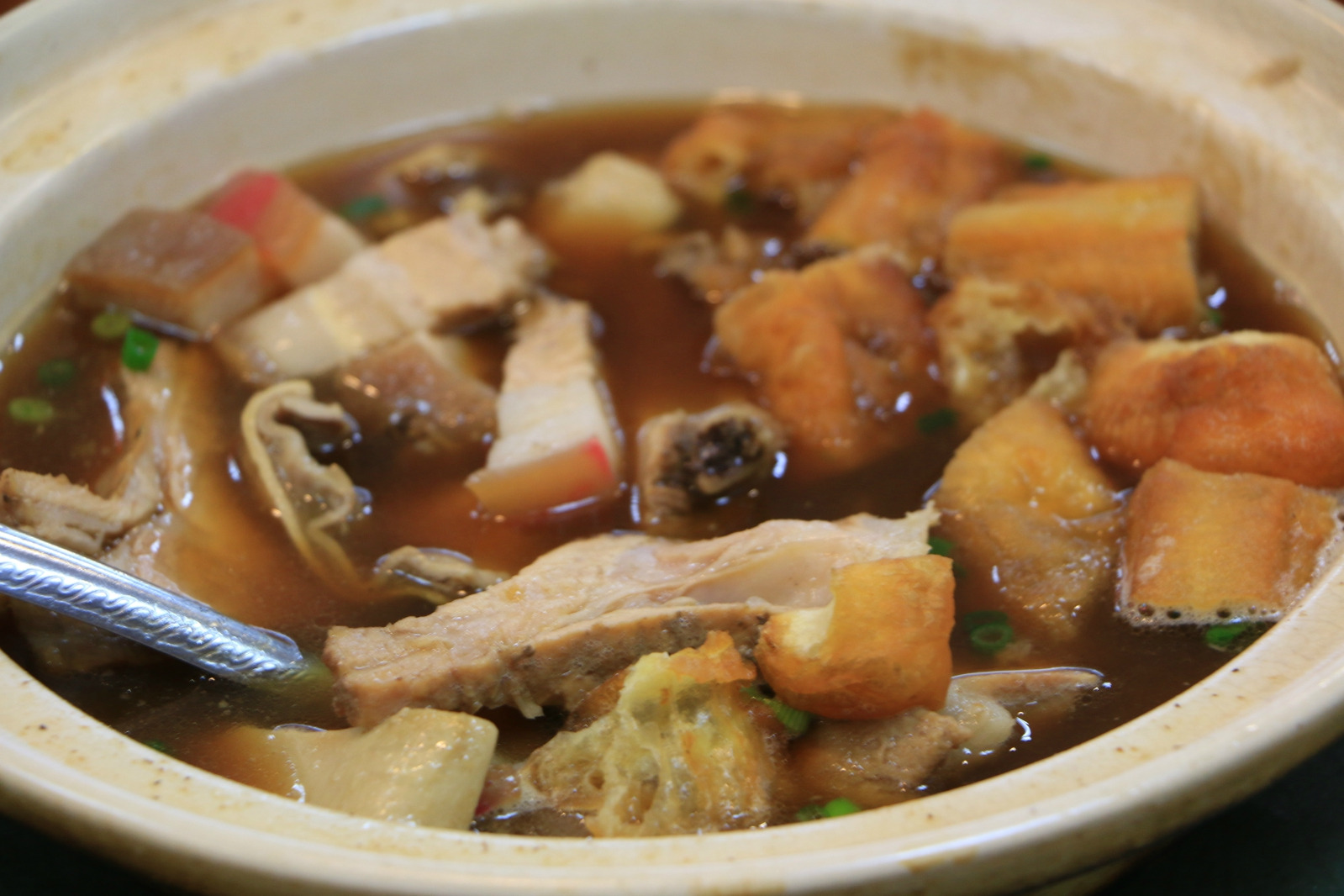 店里的招牌肉骨茶分为荤素两种,一种是纯粹的青菜,味道较为清淡,而另一种则是放入了猪肉(排骨、猪肚等原料)一起熬制而成,吃起来肥而不腻。经过对比,个人觉得荤的会比较入味,汤汁更要浓郁鲜甜。我喜欢它家的椰子布丁,整只椰子冻成的甜品,15吉令/个,椰奶味浓香、清滑,让人回味无穷。