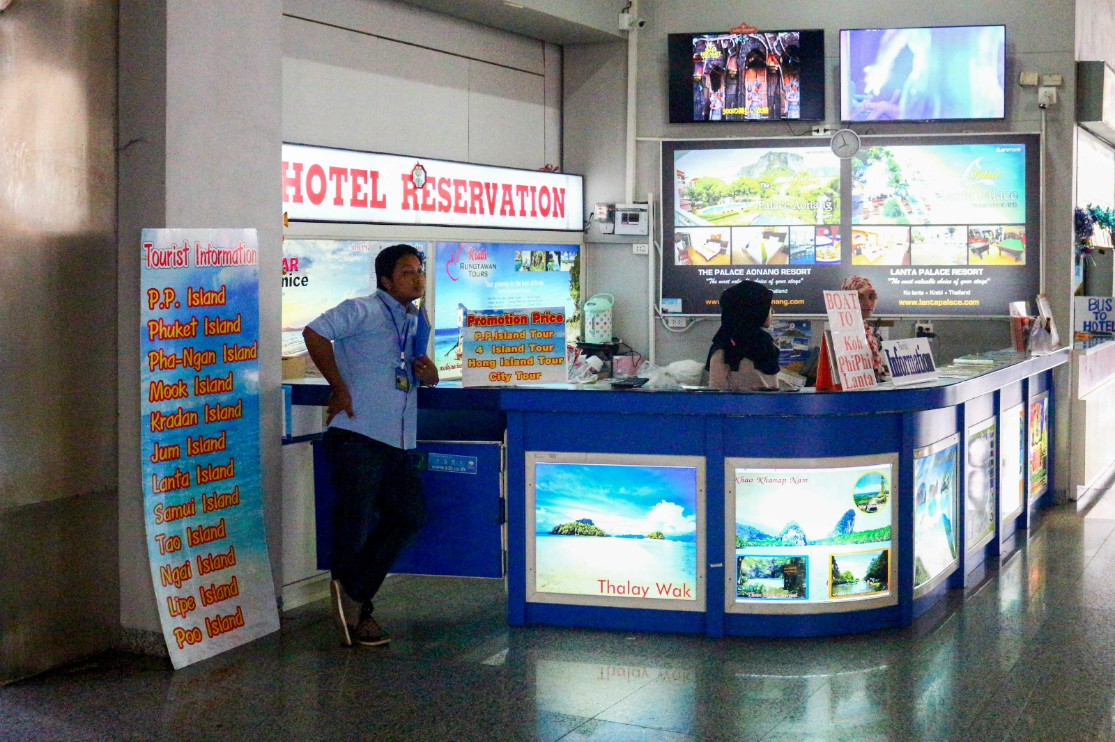 甲米国际机场(Krabi International Airport,KBV)距离甲米市中心(Krabi Town,也称甲米镇)约15公里,是前往奥南海滩(Ao Nang Beach)、莱利湾(Railay Bay)、兰塔岛(Koh Lanta)等甲米度假胜地的起降机场。甲米镇每天都有班船往返于皮皮岛(Koh Phi Phi)——泰国南部世界闻名的度假小岛。我的行程是在甲米镇住一晚,第二天上午坐公交去奥南海滩,再乘长尾船去莱利湾。中午回到甲米镇,等下午14:00的车接送到码头,坐船到皮皮岛。皮皮岛住一晚后,转天坐船到普吉岛(Phuket Island)。