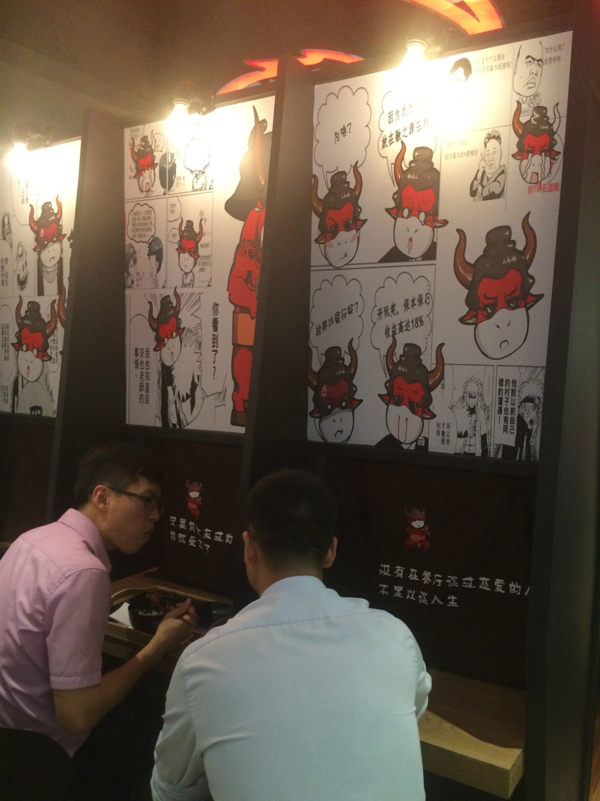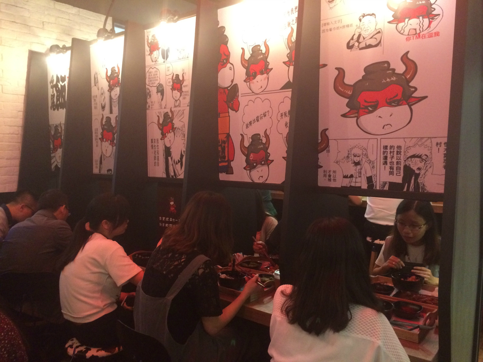 最有趣的是单人桌,是日本最近很HIT的一个人吃饭也不寂寞的桌子,单人对坐,拉开面前的布帘,对面会坐着谁呢?会不会一段美好姻缘就此开始呢?哈哈,吃个饭,脑洞也是大开。