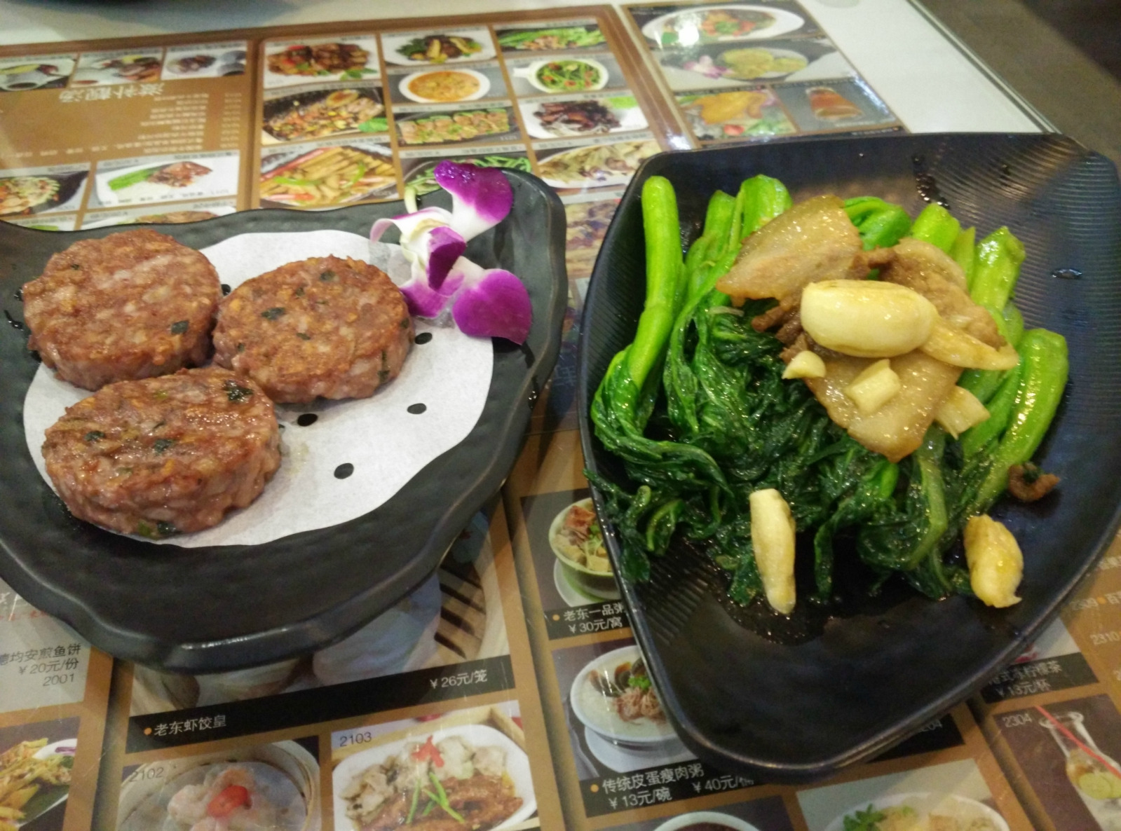 我们在网上买了两张票就跑到电影院看电影了,看的是呼吁我们关注自然环境的《美人鱼》,看完电影出来五点了差不多可以吃晚饭了,电影院在四楼,我们出来看到三楼很多吃的就决定直接在三楼找个地方吃饭,最后决定了去老东粥皇。老东粥皇的进门处就是收银台,里面的环境挺好的,位置比较宽敞,桌面上整齐的摆放着黑色的餐具,刚入座就有服务员给我们倒茶水并拿着菜单让我们点餐,我和小伙伴不知道一份粥有多少的分量,两个人各自点了一份,服务员在旁边看到很好心的提醒我们,一份粥有四五小碗的量,够我们两个人吃了。所以我们就划去了一份粥,然后点了饼子和炒青菜。